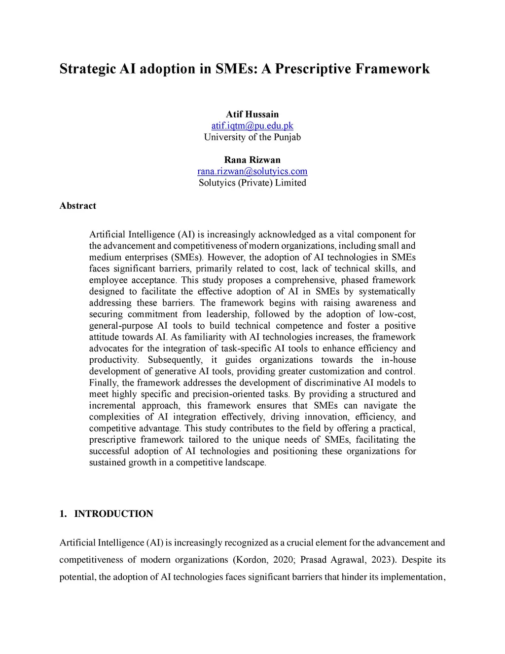 Artificial Intelligence (AI) is increasingly acknowledged as a vital component for the advancement and competitiveness of modern organizations, including small and medium enterprises (SMEs). However, the adoption of AI technologies in SMEs faces significant barriers, primarily related to cost, lack of technical skills, and employee acceptance. This study proposes a comprehensive, phased framework designed to facilitate the effective adoption of AI in SMEs by systematically addressing these barriers. The framework begins with raising awareness and securing commitment from leadership, followed by the adoption of low-cost, general-purpose AI tools to build technical competence and foster a positive attitude towards AI. As familiarity with AI technologies increases, the framework advocates for the integration of task-specific AI tools to enhance efficiency and productivity. Subsequently, it guides organizations towards the in-house development of generative AI tools, providing greater customization and control. Finally, the framework addresses the development of discriminative AI models to meet highly specific and precision-oriented tasks. By providing a structured and incremental approach, this framework ensures that SMEs can navigate the complexities of AI integration effectively, driving innovation, efficiency, and competitive advantage. This study contributes to the field by offering a practical, prescriptive framework tailored to the unique needs of SMEs, facilitating the successful adoption of AI technologies and positioning these organizations for sustained growth in a competitive landscape.