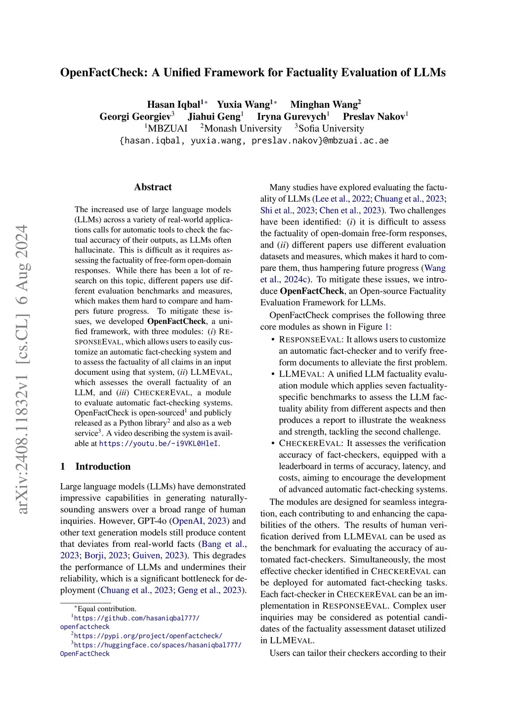 The increased use of large language models (LLMs) across a variety of real-world applications calls for automatic tools to check the factual accuracy of their outputs, as LLMs often hallucinate. This is difficult as it requires assessing the factuality of free-form open-domain responses. While there has been a lot of research on this topic, different papers use different evaluation benchmarks and measures, which makes them hard to compare and hampers future progress. To mitigate these issues, we developed OpenFactCheck, a unified framework, with three modules: (i) RESPONSEEVAL, which allows users to easily customize an automatic fact-checking system and to assess the factuality of all claims in an input document using that system, (ii) LLMEVAL, which assesses the overall factuality of an LLM, and (iii) CHECKEREVAL, a module to evaluate automatic fact-checking systems. OpenFactCheck is open-sourced (this https URL) and publicly released as a Python library (this https URL) and also as a web service (this http URL). A video describing the system is available atthis https URL.
