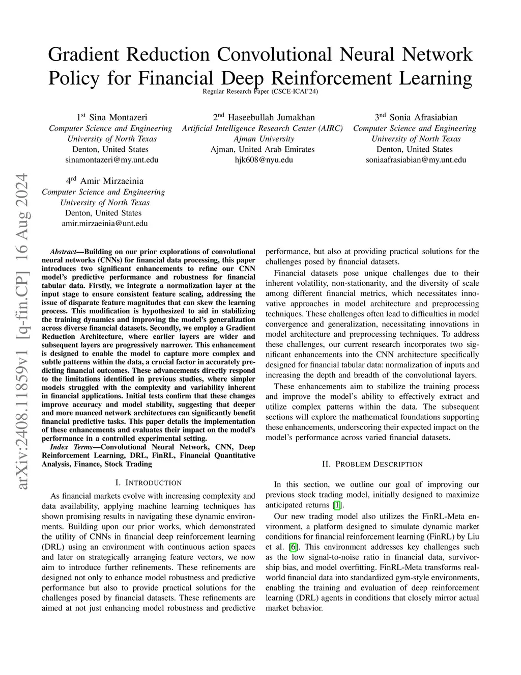 Gradient Reduction Convolutional Neural Network Policy for Financial