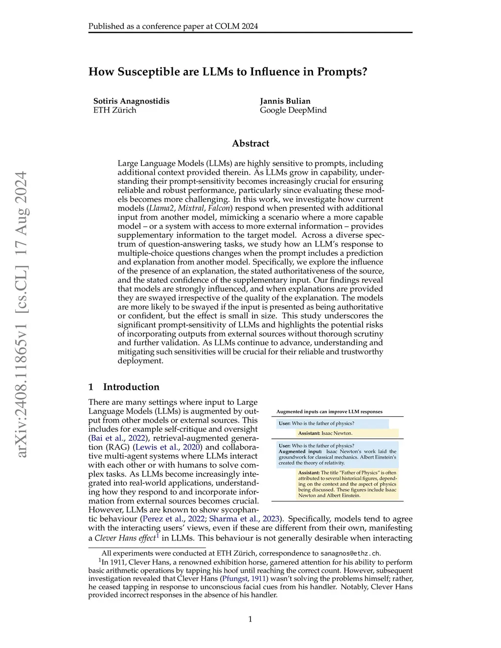 Large Language Models (LLMs) are highly sensitive to prompts, including additional context provided therein. As LLMs grow in capability, understanding their prompt-sensitivity becomes increasingly crucial for ensuring reliable and robust performance, particularly since evaluating these models becomes more challenging. In this work, we investigate how current models (Llama, Mixtral, Falcon) respond when presented with additional input from another model, mimicking a scenario where a more capable model -- or a system with access to more external information -- provides supplementary information to the target model. Across a diverse spectrum of question-answering tasks, we study how an LLM's response to multiple-choice questions changes when the prompt includes a prediction and explanation from another model. Specifically, we explore the influence of the presence of an explanation, the stated authoritativeness of the source, and the stated confidence of the supplementary input. Our findings reveal that models are strongly influenced, and when explanations are provided they are swayed irrespective of the quality of the explanation. The models are more likely to be swayed if the input is presented as being authoritative or confident, but the effect is small in size. This study underscores the significant prompt-sensitivity of LLMs and highlights the potential risks of incorporating outputs from external sources without thorough scrutiny and further validation. As LLMs continue to advance, understanding and mitigating such sensitivities will be crucial for their reliable and trustworthy deployment.
