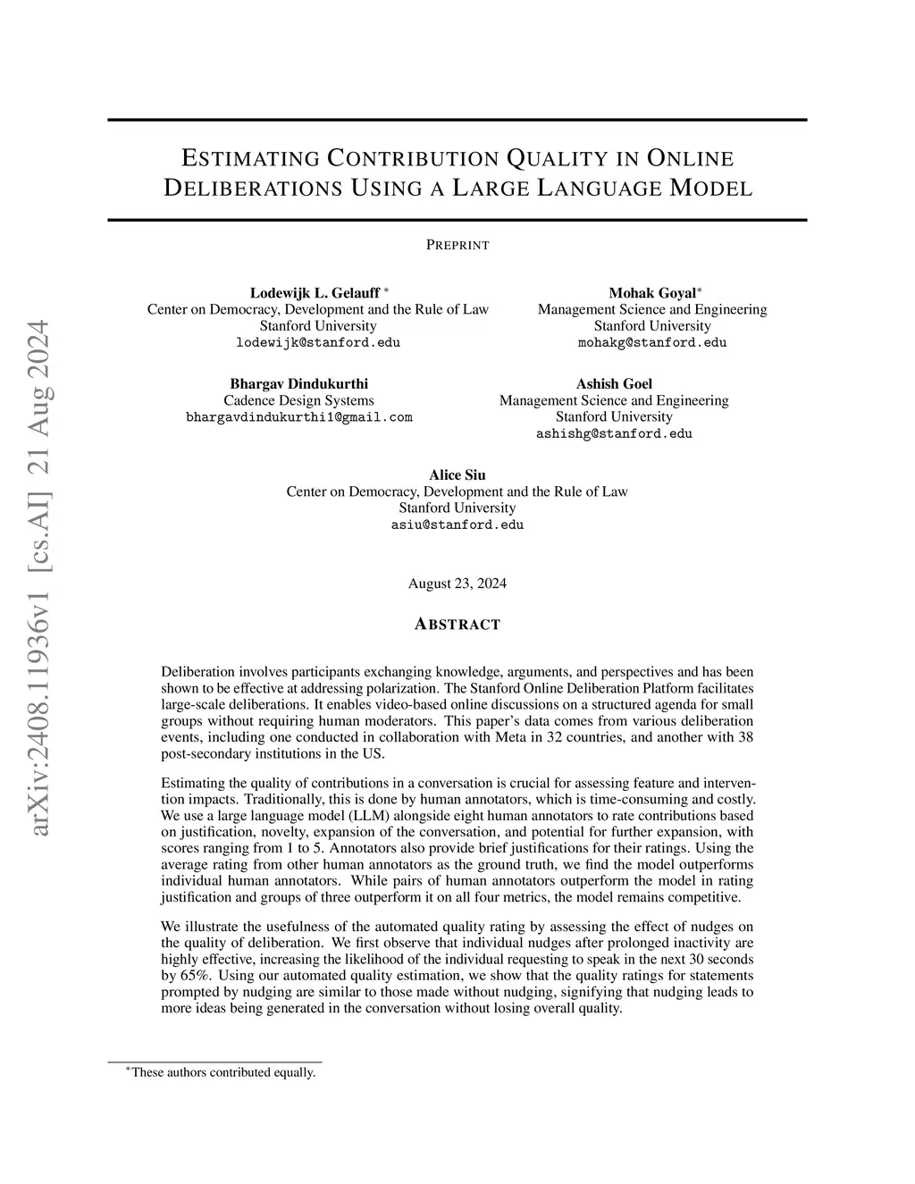 Deliberation involves participants exchanging knowledge, arguments, and perspectives and has been shown to be effective at addressing polarization. The Stanford Online Deliberation Platform facilitates large-scale deliberations. It enables video-based online discussions on a structured agenda for small groups without requiring human moderators. This paper's data comes from various deliberation events, including one conducted in collaboration with Meta in 32 countries, and another with 38 post-secondary institutions in the US. Estimating the quality of contributions in a conversation is crucial for assessing feature and intervention impacts. Traditionally, this is done by human annotators, which is time-consuming and costly. We use a large language model (LLM) alongside eight human annotators to rate contributions based on justification, novelty, expansion of the conversation, and potential for further expansion, with scores ranging from 1 to 5. Annotators also provide brief justifications for their ratings. Using the average rating from other human annotators as the ground truth, we find the model outperforms individual human annotators. While pairs of human annotators outperform the model in rating justification and groups of three outperform it on all four metrics, the model remains competitive. We illustrate the usefulness of the automated quality rating by assessing the effect of nudges on the quality of deliberation. We first observe that individual nudges after prolonged inactivity are highly effective, increasing the likelihood of the individual requesting to speak in the next 30 seconds by 65%. Using our automated quality estimation, we show that the quality ratings for statements prompted by nudging are similar to those made without nudging, signifying that nudging leads to more ideas being generated in the conversation without losing overall quality.