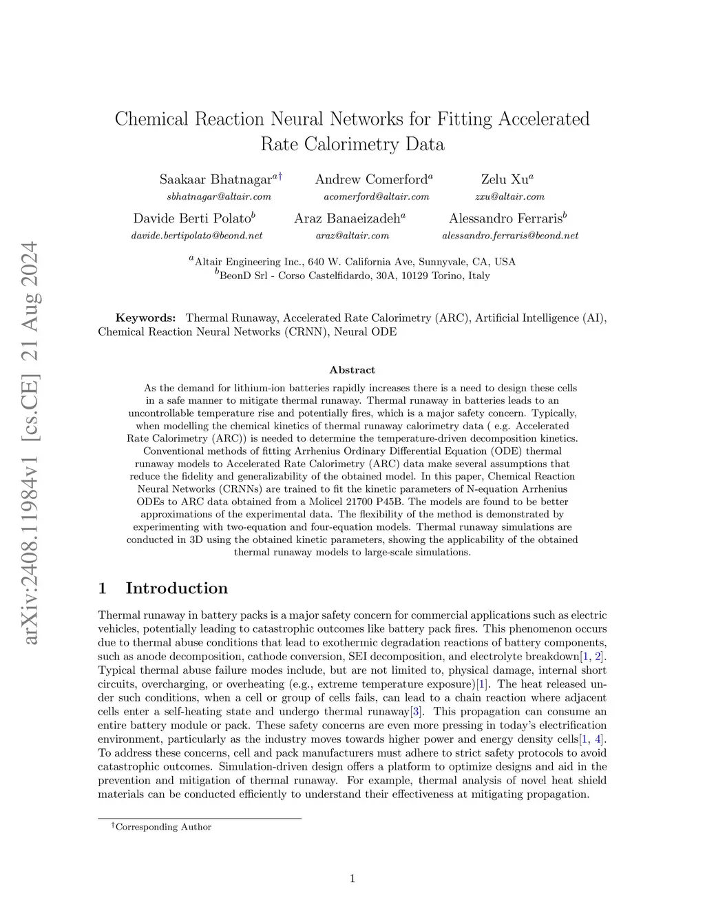 As the demand for lithium-ion batteries rapidly increases there is a need to design these cells in a safe manner to mitigate thermal runaway. Thermal runaway in batteries leads to an uncontrollable temperature rise and potentially fires, which is a major safety concern. Typically, when modelling the chemical kinetics of thermal runaway calorimetry data ( e.g. Accelerating Rate Calorimetry (ARC)) is needed to determine the temperature-driven decomposition kinetics. Conventional methods of fitting Arrhenius Ordinary Differential Equation (ODE) thermal runaway models to Accelerated Rate Calorimetry (ARC) data make several assumptions that reduce the fidelity and generalizability of the obtained model. In this paper, Chemical Reaction Neural Networks (CRNNs) are trained to fit the kinetic parameters of N-equation Arrhenius ODEs to ARC data obtained from a Molicel 21700 P45B. The models are found to be better approximations of the experimental data. The flexibility of the method is demonstrated by experimenting with two-equation and four-equation models. Thermal runaway simulations are conducted in 3D using the obtained kinetic parameters, showing the applicability of the obtained thermal runaway models to large-scale simulations.