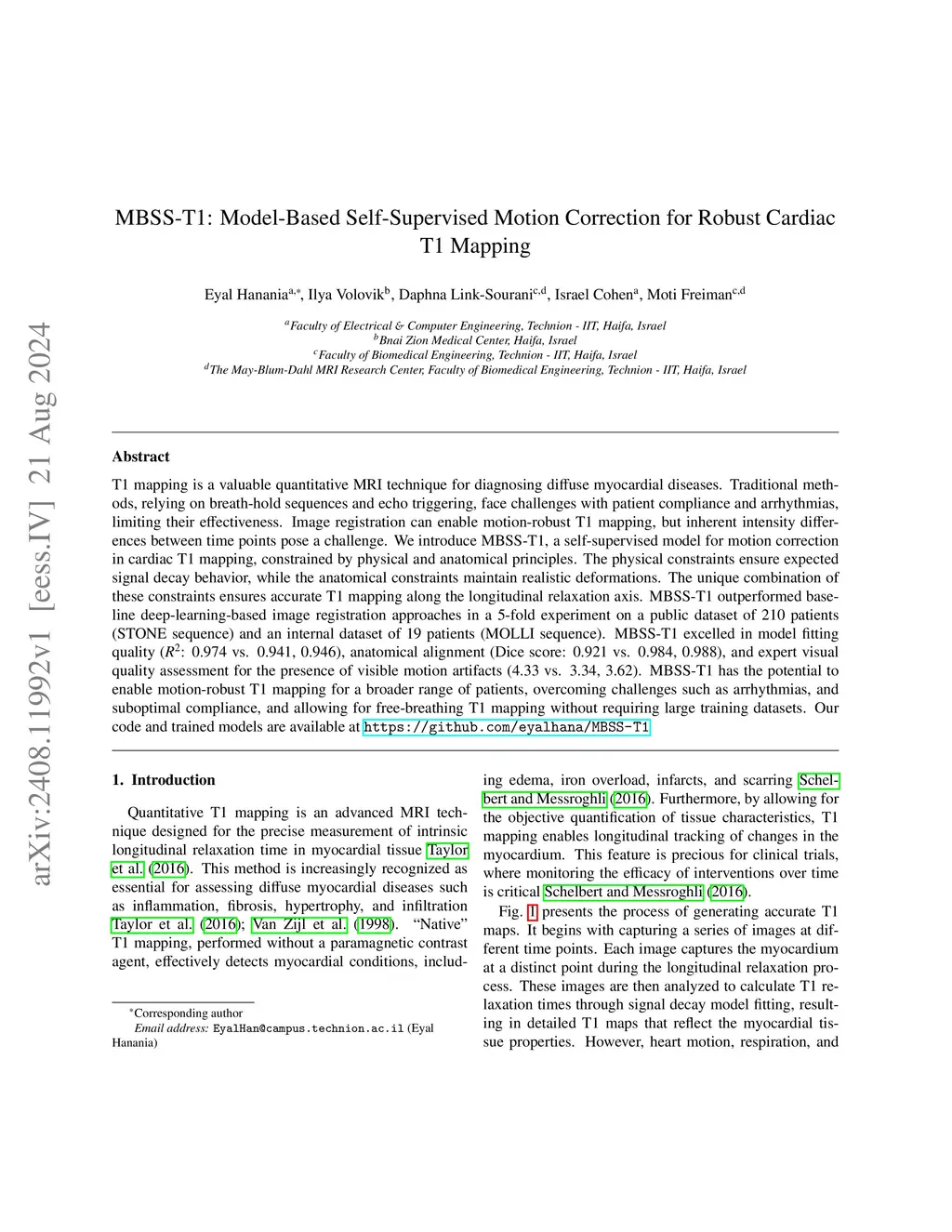 Cardiac T1 mapping is a valuable quantitative MRI technique for diagnosing diffuse myocardial diseases. Traditional methods, relying on breath-hold sequences and cardiac triggering based on an ECG signal, face challenges with patient compliance, limiting their effectiveness. Image registration can enable motion-robust cardiac T1 mapping, but inherent intensity differences between time points pose a challenge. We present MBSS-T1, a subject-specific self-supervised model for motion correction in cardiac T1 mapping. Physical constraints, implemented through a loss function comparing synthesized and motion-corrected images, enforce signal decay behavior, while anatomical constraints, applied via a Dice loss, ensure realistic deformations. The unique combination of these constraints results in motion-robust cardiac T1 mapping along the longitudinal relaxation axis. In a 5-fold experiment on a public dataset of 210 patients (STONE sequence) and an internal dataset of 19 patients (MOLLI sequence), MBSS-T1 outperformed baseline deep-learning registration methods. It achieved superior model fitting quality (: 0.975 vs. 0.941, 0.946 for STONE; 0.987 vs. 0.982, 0.965 for MOLLI free-breathing; 0.994 vs. 0.993, 0.991 for MOLLI breath-hold), anatomical alignment (Dice: 0.89 vs. 0.84, 0.88 for STONE; 0.963 vs. 0.919, 0.851 for MOLLI free-breathing; 0.954 vs. 0.924, 0.871 for MOLLI breath-hold), and visual quality (4.33 vs. 3.38, 3.66 for STONE; 4.1 vs. 3.5, 3.28 for MOLLI free-breathing; 3.79 vs. 3.15, 2.84 for MOLLI breath-hold). MBSS-T1 enables motion-robust T1 mapping for broader patient populations, overcoming challenges such as suboptimal compliance, and facilitates free-breathing cardiac T1 mapping without requiring large annotated datasets. Our code is available atthis https URL.