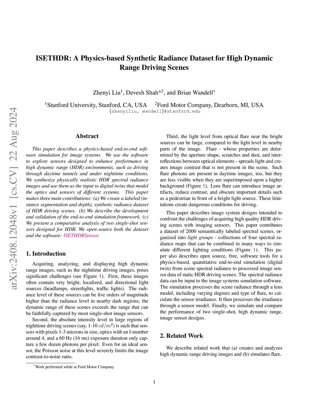 This paper describes a physics-based end-to-end software simulation for image systems. We use the software to explore sensors designed to enhance performance in high dynamic range (HDR) environments, such as driving through daytime tunnels and under nighttime conditions. We synthesize physically realistic HDR spectral radiance images and use them as the input to digital twins that model the optics and sensors of different systems. This paper makes three main contributions: (a) We create a labeled (instance segmentation and depth), synthetic radiance dataset of HDR driving scenes. (b) We describe the development and validation of the end-to-end simulation framework. (c) We present a comparative analysis of two single-shot sensors designed for HDR. We open-source both the dataset and the software.