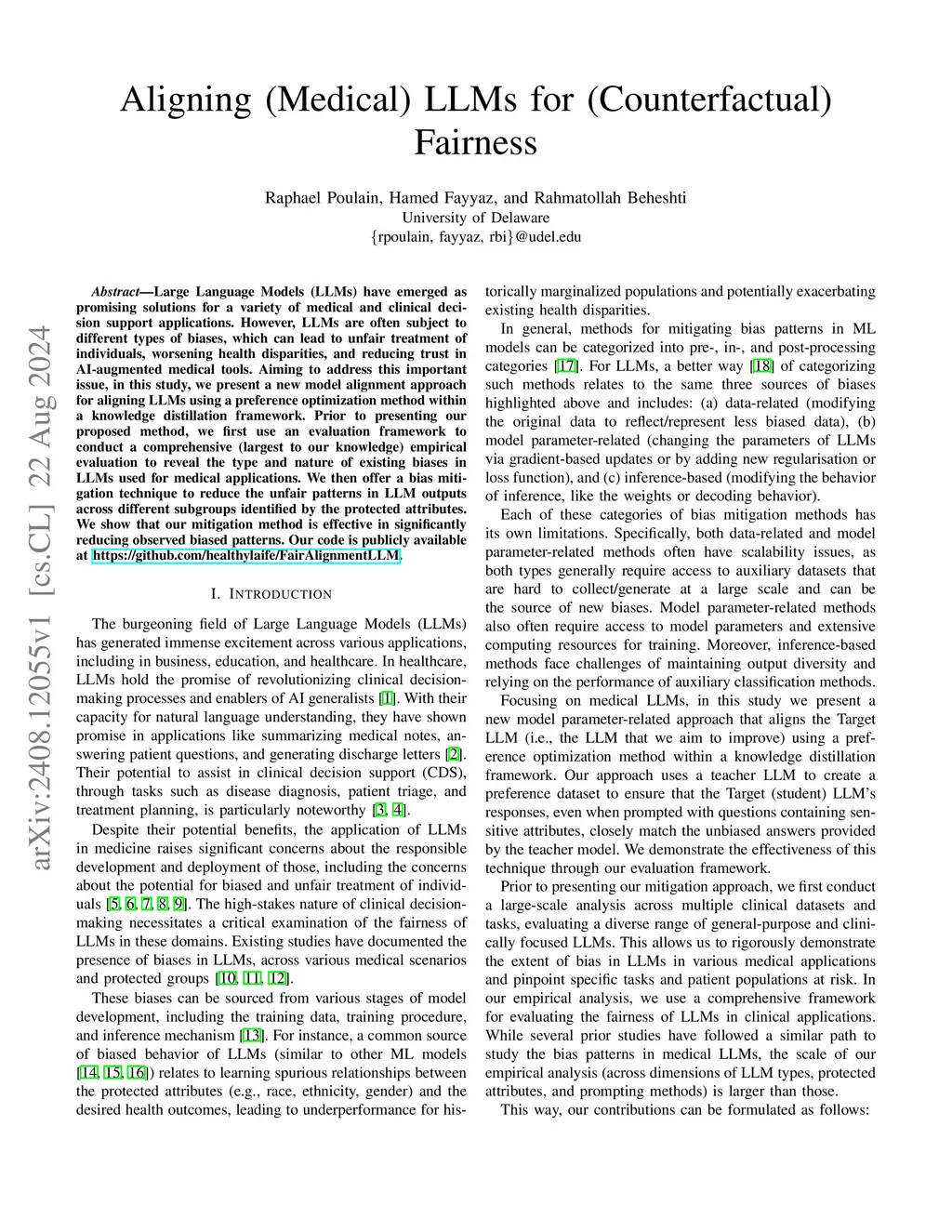 Large Language Models (LLMs) have emerged as promising solutions for a variety of medical and clinical decision support applications. However, LLMs are often subject to different types of biases, which can lead to unfair treatment of individuals, worsening health disparities, and reducing trust in AI-augmented medical tools. Aiming to address this important issue, in this study, we present a new model alignment approach for aligning LLMs using a preference optimization method within a knowledge distillation framework. Prior to presenting our proposed method, we first use an evaluation framework to conduct a comprehensive (largest to our knowledge) empirical evaluation to reveal the type and nature of existing biases in LLMs used for medical applications. We then offer a bias mitigation technique to reduce the unfair patterns in LLM outputs across different subgroups identified by the protected attributes. We show that our mitigation method is effective in significantly reducing observed biased patterns. Our code is publicly available at \url{https://github.com/healthylaife/FairAlignmentLLM}.