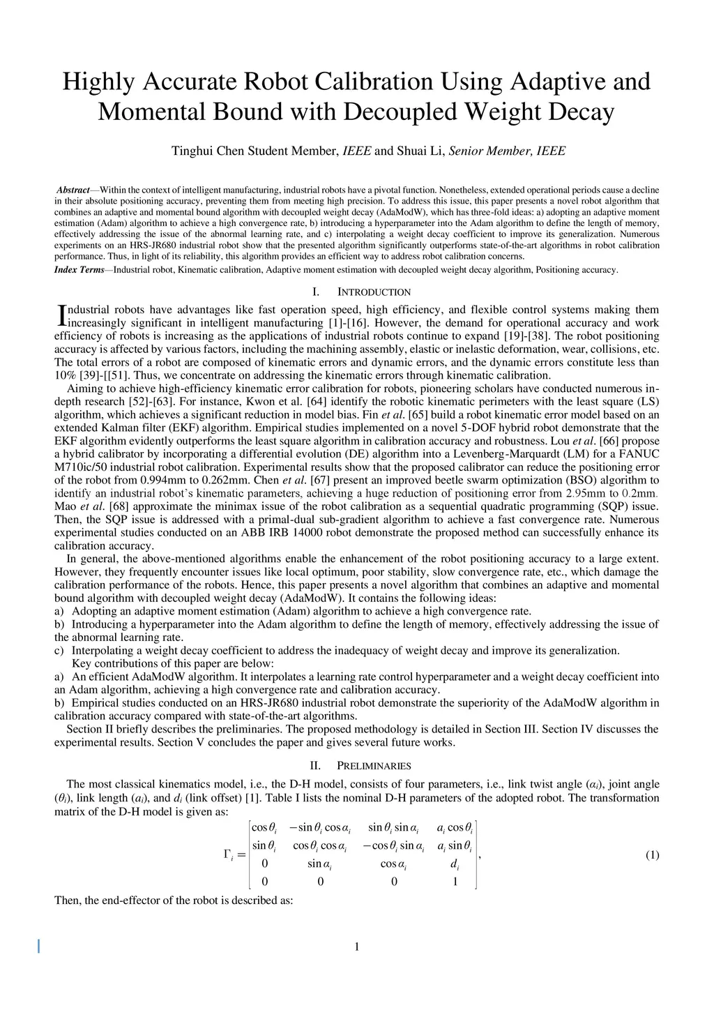 Within the context of intelligent manufacturing, industrial robots have a pivotal function. Nonetheless, extended operational periods cause a decline in their absolute positioning accuracy, preventing them from meeting high precision. To address this issue, this paper presents a novel robot algorithm that combines an adaptive and momental bound algorithm with decoupled weight decay (AdaModW), which has three-fold ideas: a) adopting an adaptive moment estimation (Adam) algorithm to achieve a high convergence rate, b) introducing a hyperparameter into the Adam algorithm to define the length of memory, effectively addressing the issue of the abnormal learning rate, and c) interpolating a weight decay coefficient to improve its generalization. Numerous experiments on an HRS-JR680 industrial robot show that the presented algorithm significantly outperforms state-of-the-art algorithms in robot calibration performance. Thus, in light of its reliability, this algorithm provides an efficient way to address robot calibration concerns.