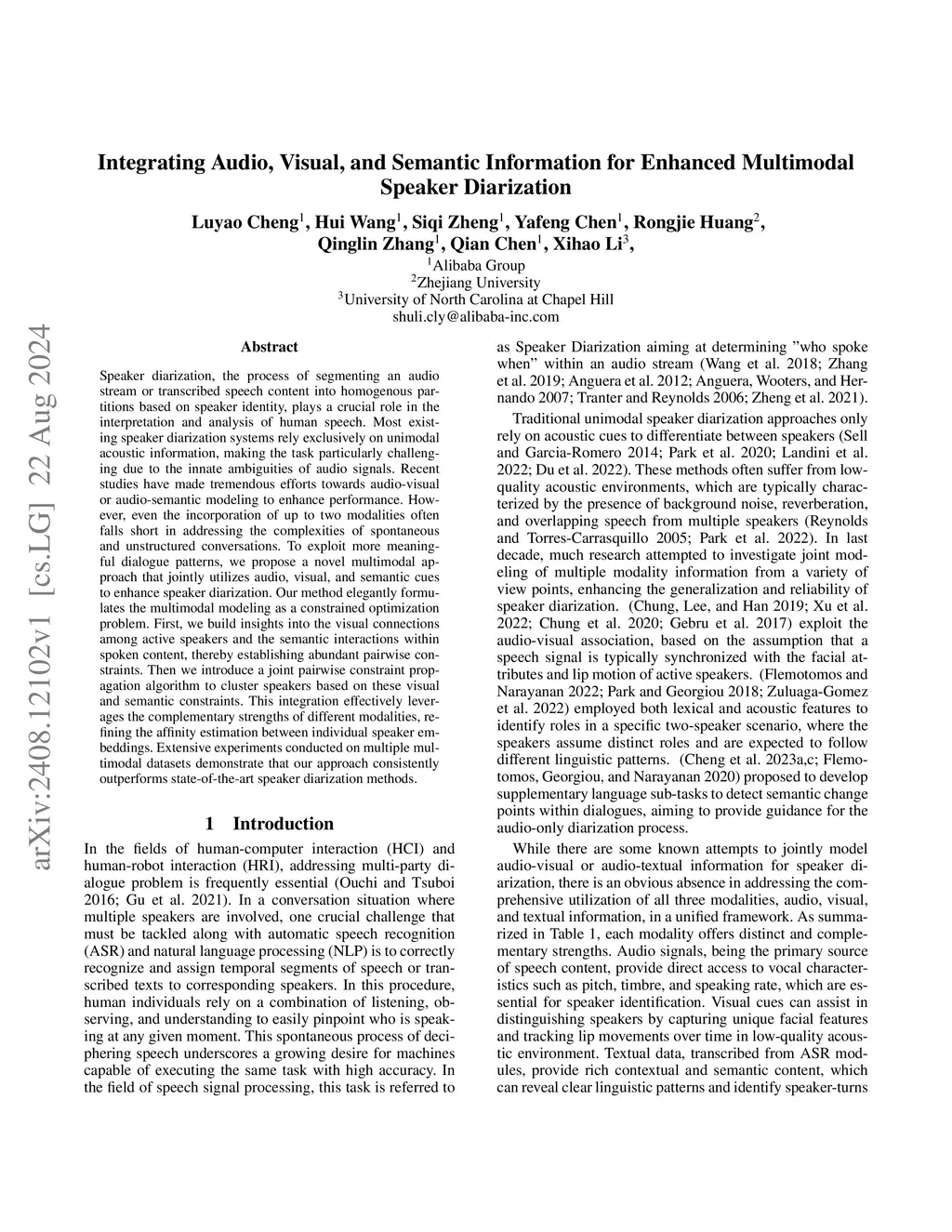 Speaker diarization, the process of segmenting an audio stream or transcribed speech content into homogenous partitions based on speaker identity, plays a crucial role in the interpretation and analysis of human speech. Most existing speaker diarization systems rely exclusively on unimodal acoustic information, making the task particularly challenging due to the innate ambiguities of audio signals. Recent studies have made tremendous efforts towards audio-visual or audio-semantic modeling to enhance performance. However, even the incorporation of up to two modalities often falls short in addressing the complexities of spontaneous and unstructured conversations. To exploit more meaningful dialogue patterns, we propose a novel multimodal approach that jointly utilizes audio, visual, and semantic cues to enhance speaker diarization. Our method elegantly formulates the multimodal modeling as a constrained optimization problem. First, we build insights into the visual connections among active speakers and the semantic interactions within spoken content, thereby establishing abundant pairwise constraints. Then we introduce a joint pairwise constraint propagation algorithm to cluster speakers based on these visual and semantic constraints. This integration effectively leverages the complementary strengths of different modalities, refining the affinity estimation between individual speaker embeddings. Extensive experiments conducted on multiple multimodal datasets demonstrate that our approach consistently outperforms state-of-the-art speaker diarization methods.