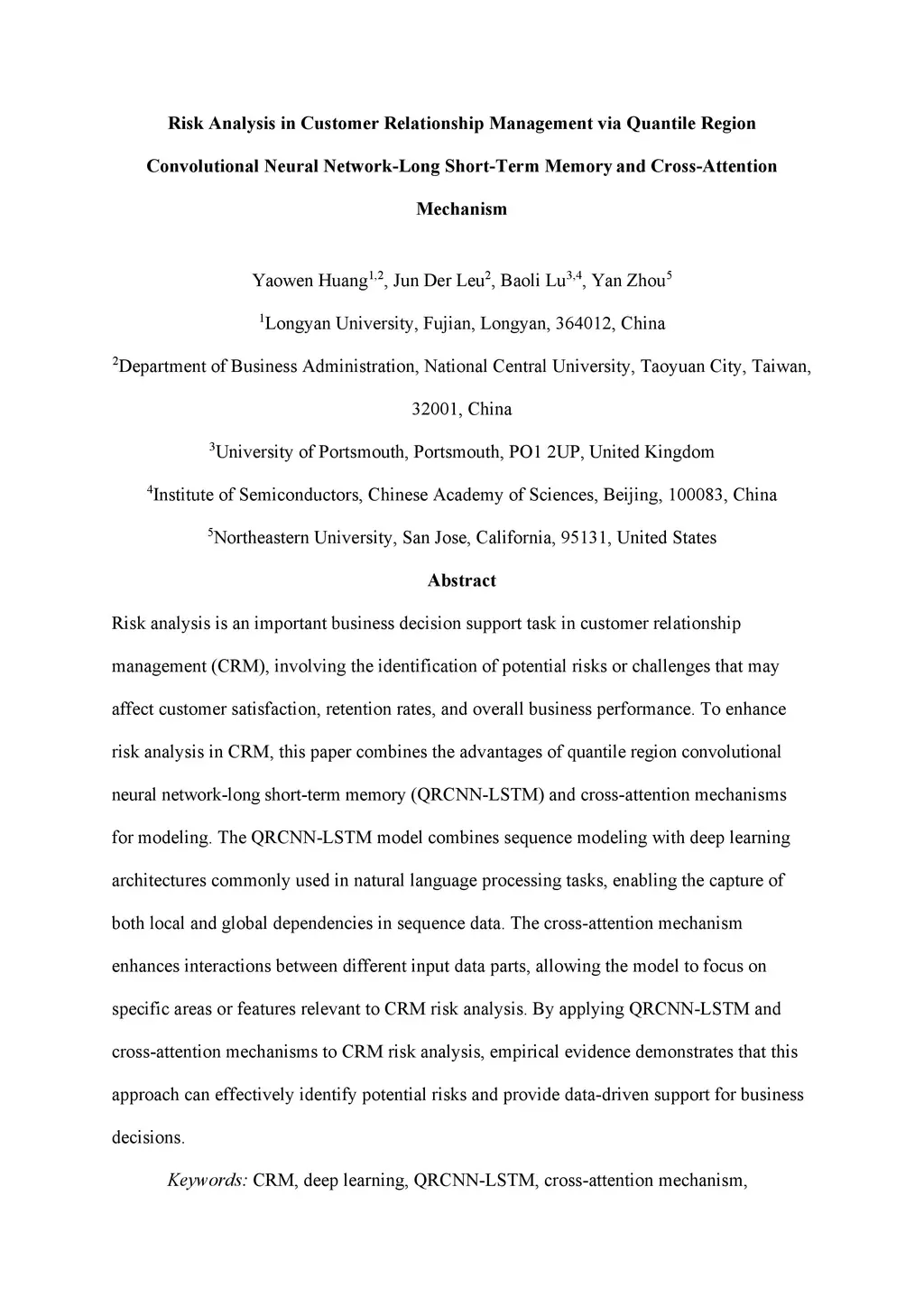 Risk analysis is an important business decision support task in customer relationship management (CRM), involving the identification of potential risks or challenges that may affect customer satisfaction, retention rates, and overall business performance. To enhance risk analysis in CRM, this paper combines the advantages of quantile region convolutional neural network-long short-term memory (QRCNN-LSTM) and cross-attention mechanisms for modeling. The QRCNN-LSTM model combines sequence modeling with deep learning architectures commonly used in natural language processing tasks, enabling the capture of both local and global dependencies in sequence data. The cross-attention mechanism enhances interactions between different input data parts, allowing the model to focus on specific areas or features relevant to CRM risk analysis. By applying QRCNN-LSTM and cross-attention mechanisms to CRM risk analysis, empirical evidence demonstrates that this approach can effectively identify potential risks and provide data-driven support for business decisions.
