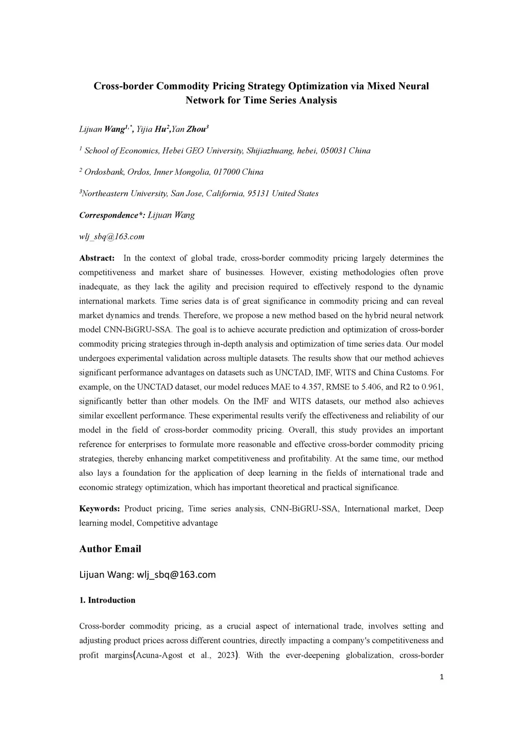 In the context of global trade, cross-border commodity pricing largely determines the competitiveness and market share of businesses. However, existing methodologies often prove inadequate, as they lack the agility and precision required to effectively respond to the dynamic international markets. Time series data is of great significance in commodity pricing and can reveal market dynamics and trends. Therefore, we propose a new method based on the hybrid neural network model CNN-BiGRU-SSA. The goal is to achieve accurate prediction and optimization of cross-border commodity pricing strategies through in-depth analysis and optimization of time series data. Our model undergoes experimental validation across multiple datasets. The results show that our method achieves significant performance advantages on datasets such as UNCTAD, IMF, WITS and China Customs. For example, on the UNCTAD dataset, our model reduces MAE to 4.357, RMSE to 5.406, and R2 to 0.961, significantly better than other models. On the IMF and WITS datasets, our method also achieves similar excellent performance. These experimental results verify the effectiveness and reliability of our model in the field of cross-border commodity pricing. Overall, this study provides an important reference for enterprises to formulate more reasonable and effective cross-border commodity pricing strategies, thereby enhancing market competitiveness and profitability. At the same time, our method also lays a foundation for the application of deep learning in the fields of international trade and economic strategy optimization, which has important theoretical and practical significance.