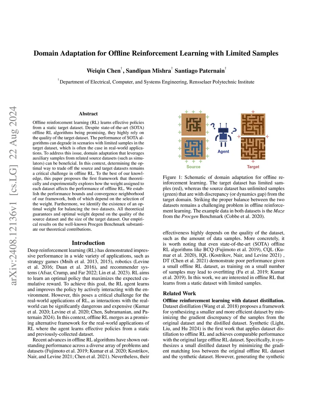 Offline reinforcement learning (RL) learns effective policies from a static target dataset. The performance of state-of-the-art offline RL algorithms notwithstanding, it relies on the size of the target dataset, and it degrades if limited samples in the target dataset are available, which is often the case in real-world applications. To address this issue, domain adaptation that leverages auxiliary samples from related source datasets (such as simulators) can be beneficial. However, establishing the optimal way to trade off the limited target dataset and the large-but-biased source dataset while ensuring provably theoretical guarantees remains an open challenge. To the best of our knowledge, this paper proposes the first framework that theoretically explores the impact of the weights assigned to each dataset on the performance of offline RL. In particular, we establish performance bounds and the existence of the optimal weight, which can be computed in closed form under simplifying assumptions. We also provide algorithmic guarantees in terms of convergence to a neighborhood of the optimum. Notably, these results depend on the quality of the source dataset and the number of samples in the target dataset. Our empirical results on the well-known Procgen and MuJoCo benchmarks substantiate the theoretical contributions in this work.