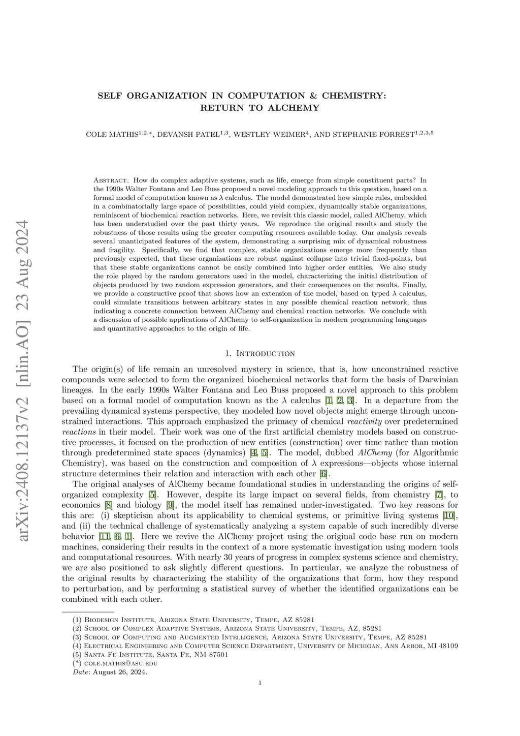 How do complex adaptive systems, such as life, emerge from simple constituent parts? In the 1990s Walter Fontana and Leo Buss proposed a novel modeling approach to this question, based on a formal model of computation known as calculus. The model demonstrated how simple rules, embedded in a combinatorially large space of possibilities, could yield complex, dynamically stable organizations, reminiscent of biochemical reaction networks. Here, we revisit this classic model, called AlChemy, which has been understudied over the past thirty years. We reproduce the original results and study the robustness of those results using the greater computing resources available today. Our analysis reveals several unanticipated features of the system, demonstrating a surprising mix of dynamical robustness and fragility. Specifically, we find that complex, stable organizations emerge more frequently than previously expected, that these organizations are robust against collapse into trivial fixed-points, but that these stable organizations cannot be easily combined into higher order entities. We also study the role played by the random generators used in the model, characterizing the initial distribution of objects produced by two random expression generators, and their consequences on the results. Finally, we provide a constructive proof that shows how an extension of the model, based on typed calculus, could simulate transitions between arbitrary states in any possible chemical reaction network, thus indicating a concrete connection between AlChemy and chemical reaction networks. We conclude with a discussion of possible applications of AlChemy to self-organization in modern programming languages and quantitative approaches to the origin of life.
