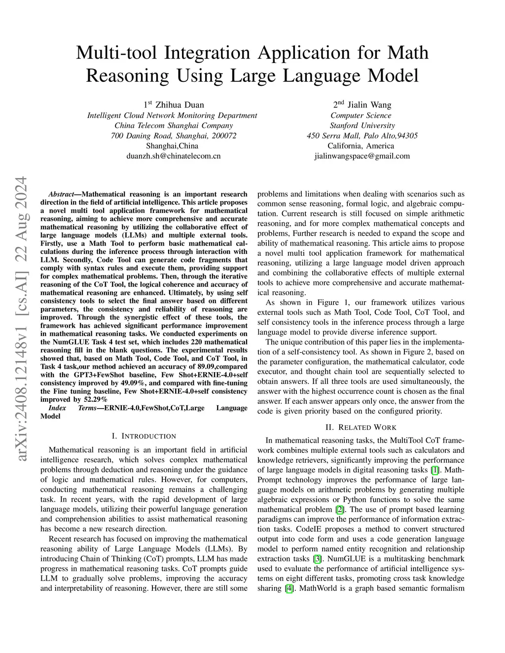 Mathematical reasoning is an important research direction in the field of artificial intelligence. This article proposes a novel multi tool application framework for mathematical reasoning, aiming to achieve more comprehensive and accurate mathematical reasoning by utilizing the collaborative effect of large language models (LLMs) and multiple external tools. Firstly, use a Math Tool to perform basic mathematical calculations during the inference process through interaction with LLM. Secondly, Code Tool can generate code fragments that comply with syntax rules and execute them, providing support for complex mathematical problems. Then, through the iterative reasoning of the CoT Tool, the logical coherence and accuracy of mathematical reasoning are enhanced. Ultimately, by using self consistency tools to select the final answer based on different parameters, the consistency and reliability of reasoning are improved. Through the synergistic effect of these tools, the framework has achieved significant performance improvement in mathematical reasoning tasks. We conducted experiments on the NumGLUE Task 4 test set, which includes 220 mathematical reasoning fill in the blank questions. The experimental results showed that, based on Math Tool, Code Tool, and CoT Tool, in Task 4 task,our method achieved an accuracy of 89.09,compared with the GPT3+FewShot baseline, Few Shot+ERNIE-4.0+self consistency improved by 49.09%, and compared with fine-tuning the Fine tuning baseline, Few Shot+ERNIE-4.0+self consistency improved by 52.29%