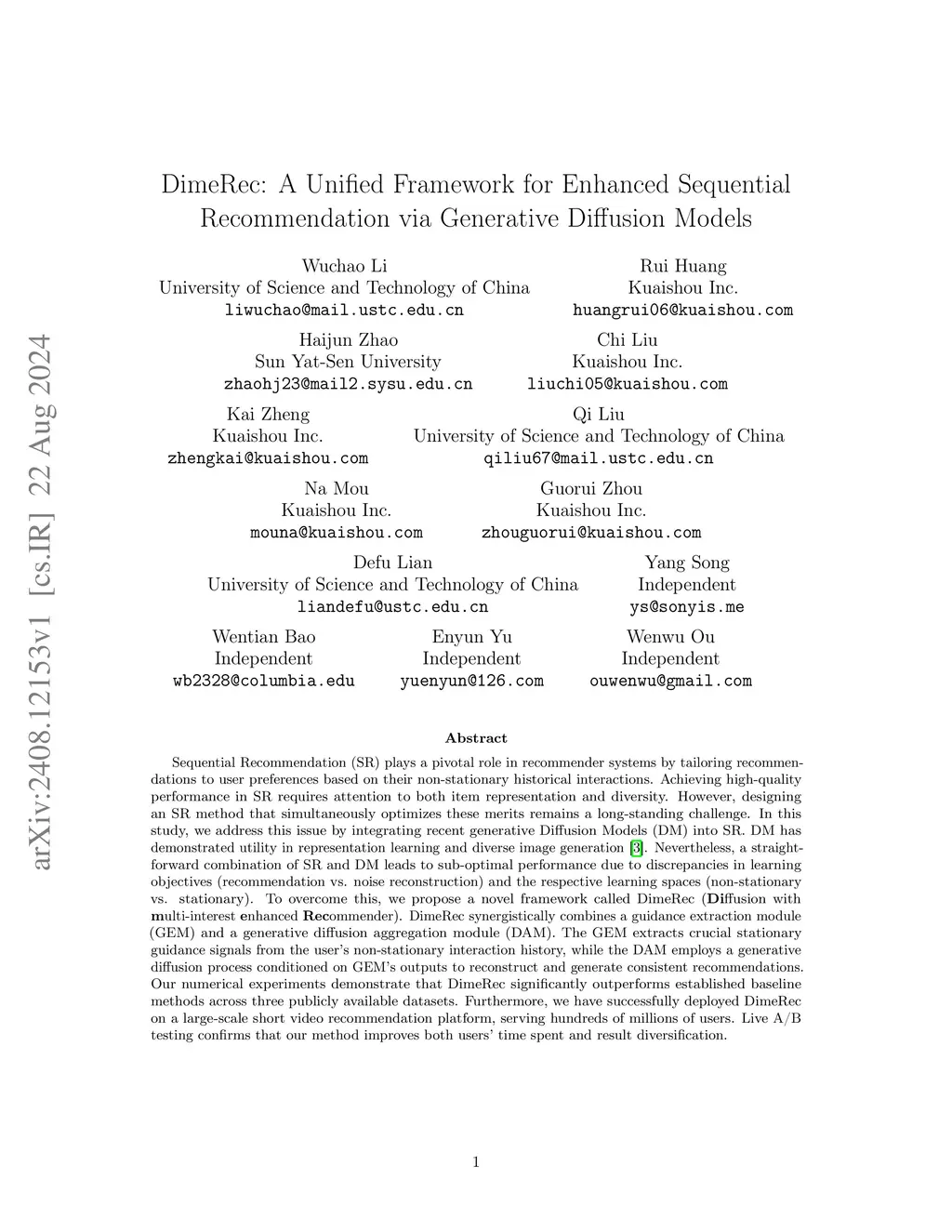 Sequential Recommendation (SR) plays a pivotal role in recommender systems by tailoring recommendations to user preferences based on their non-stationary historical interactions. Achieving high-quality performance in SR requires attention to both item representation and diversity. However, designing an SR method that simultaneously optimizes these merits remains a long-standing challenge. In this study, we address this issue by integrating recent generative Diffusion Models (DM) into SR. DM has demonstrated utility in representation learning and diverse image generation. Nevertheless, a straightforward combination of SR and DM leads to sub-optimal performance due to discrepancies in learning objectives (recommendation vs. noise reconstruction) and the respective learning spaces (non-stationary vs. stationary). To overcome this, we propose a novel framework called DimeRec (\textbf{Di}ffusion with \textbf{m}ulti-interest \textbf{e}nhanced \textbf{Rec}ommender). DimeRec synergistically combines a guidance extraction module (GEM) and a generative diffusion aggregation module (DAM). The GEM extracts crucial stationary guidance signals from the user's non-stationary interaction history, while the DAM employs a generative diffusion process conditioned on GEM's outputs to reconstruct and generate consistent recommendations. Our numerical experiments demonstrate that DimeRec significantly outperforms established baseline methods across three publicly available datasets. Furthermore, we have successfully deployed DimeRec on a large-scale short video recommendation platform, serving hundreds of millions of users. Live A/B testing confirms that our method improves both users' time spent and result diversification.