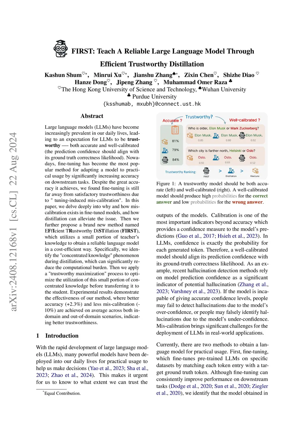 Large language models (LLMs) have become increasingly prevalent in our daily lives, leading to an expectation for LLMs to be trustworthy -- - both accurate and well-calibrated (the prediction confidence should align with its ground truth correctness likelihood). Nowadays, fine-tuning has become the most popular method for adapting a model to practical usage by significantly increasing accuracy on downstream tasks. Despite the great accuracy it achieves, we found fine-tuning is still far away from satisfactory trustworthiness due to "tuning-induced mis-calibration". In this paper, we delve deeply into why and how mis-calibration exists in fine-tuned models, and how distillation can alleviate the issue. Then we further propose a brand new method named Efficient Trustworthy Distillation (FIRST), which utilizes a small portion of teacher's knowledge to obtain a reliable language model in a cost-efficient way. Specifically, we identify the "concentrated knowledge" phenomenon during distillation, which can significantly reduce the computational burden. Then we apply a "trustworthy maximization" process to optimize the utilization of this small portion of concentrated knowledge before transferring it to the student. Experimental results demonstrate the effectiveness of our method, where better accuracy (+2.3%) and less mis-calibration (-10%) are achieved on average across both in-domain and out-of-domain scenarios, indicating better trustworthiness.