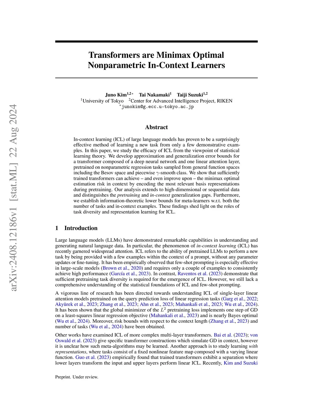 In-context learning (ICL) of large language models has proven to be a surprisingly effective method of learning a new task from only a few demonstrative examples. In this paper, we study the efficacy of ICL from the viewpoint of statistical learning theory. We develop approximation and generalization error bounds for a transformer composed of a deep neural network and one linear attention layer, pretrained on nonparametric regression tasks sampled from general function spaces including the Besov space and piecewise -smooth class. We show that sufficiently trained transformers can achieve -- and even improve upon -- the minimax optimal estimation risk in context by encoding the most relevant basis representations during pretraining. Our analysis extends to high-dimensional or sequential data and distinguishes the \emph{pretraining} and \emph{in-context} generalization gaps. Furthermore, we establish information-theoretic lower bounds for meta-learners w.r.t. both the number of tasks and in-context examples. These findings shed light on the roles of task diversity and representation learning for ICL.