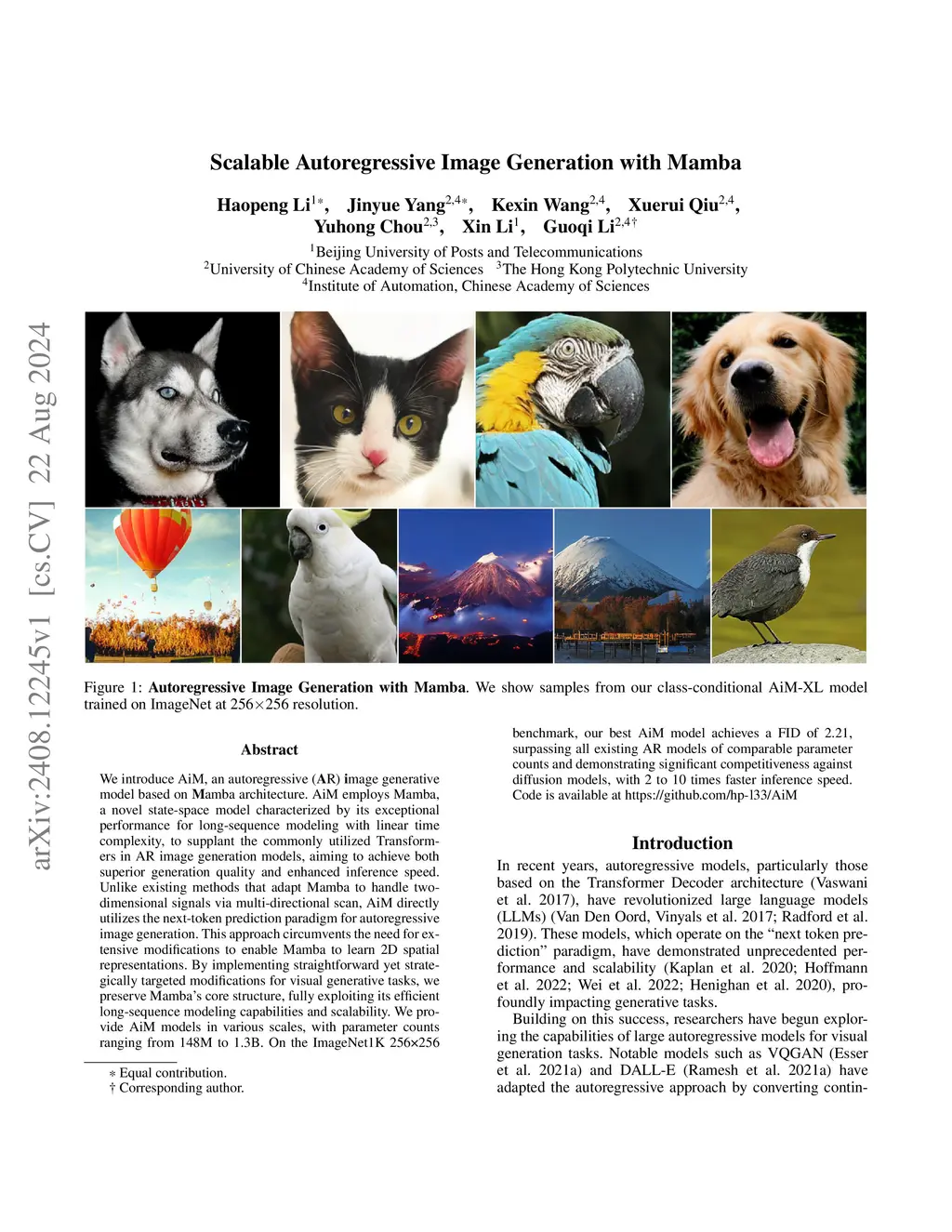 We introduce AiM, an autoregressive (AR) image generative model based on Mamba architecture. AiM employs Mamba, a novel state-space model characterized by its exceptional performance for long-sequence modeling with linear time complexity, to supplant the commonly utilized Transformers in AR image generation models, aiming to achieve both superior generation quality and enhanced inference speed. Unlike existing methods that adapt Mamba to handle two-dimensional signals via multi-directional scan, AiM directly utilizes the next-token prediction paradigm for autoregressive image generation. This approach circumvents the need for extensive modifications to enable Mamba to learn 2D spatial representations. By implementing straightforward yet strategically targeted modifications for visual generative tasks, we preserve Mamba's core structure, fully exploiting its efficient long-sequence modeling capabilities and scalability. We provide AiM models in various scales, with parameter counts ranging from 148M to 1.3B. On the ImageNet1K 256*256 benchmark, our best AiM model achieves a FID of 2.21, surpassing all existing AR models of comparable parameter counts and demonstrating significant competitiveness against diffusion models, with 2 to 10 times faster inference speed. Code is available atthis https URL