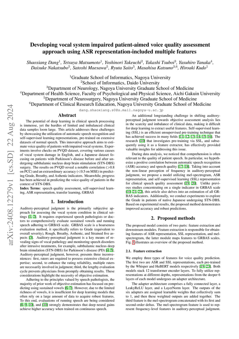 The potential of deep learning in clinical speech processing is immense, yet the hurdles of limited and imbalanced clinical data samples loom large. This article addresses these challenges by showcasing the utilization of automatic speech recognition and self-supervised learning representations, pre-trained on extensive datasets of normal speech. This innovative approach aims to estimate voice quality of patients with impaired vocal systems. Experiments involve checks on PVQD dataset, covering various causes of vocal system damage in English, and a Japanese dataset focusing on patients with Parkinson's disease before and after undergoing subthalamic nucleus deep brain stimulation (STN-DBS) surgery. The results on PVQD reveal a notable correlation (>0.8 on PCC) and an extraordinary accuracy (<0.5 on MSE) in predicting Grade, Breathy, and Asthenic indicators. Meanwhile, progress has been achieved in predicting the voice quality of patients in the context of STN-DBS.