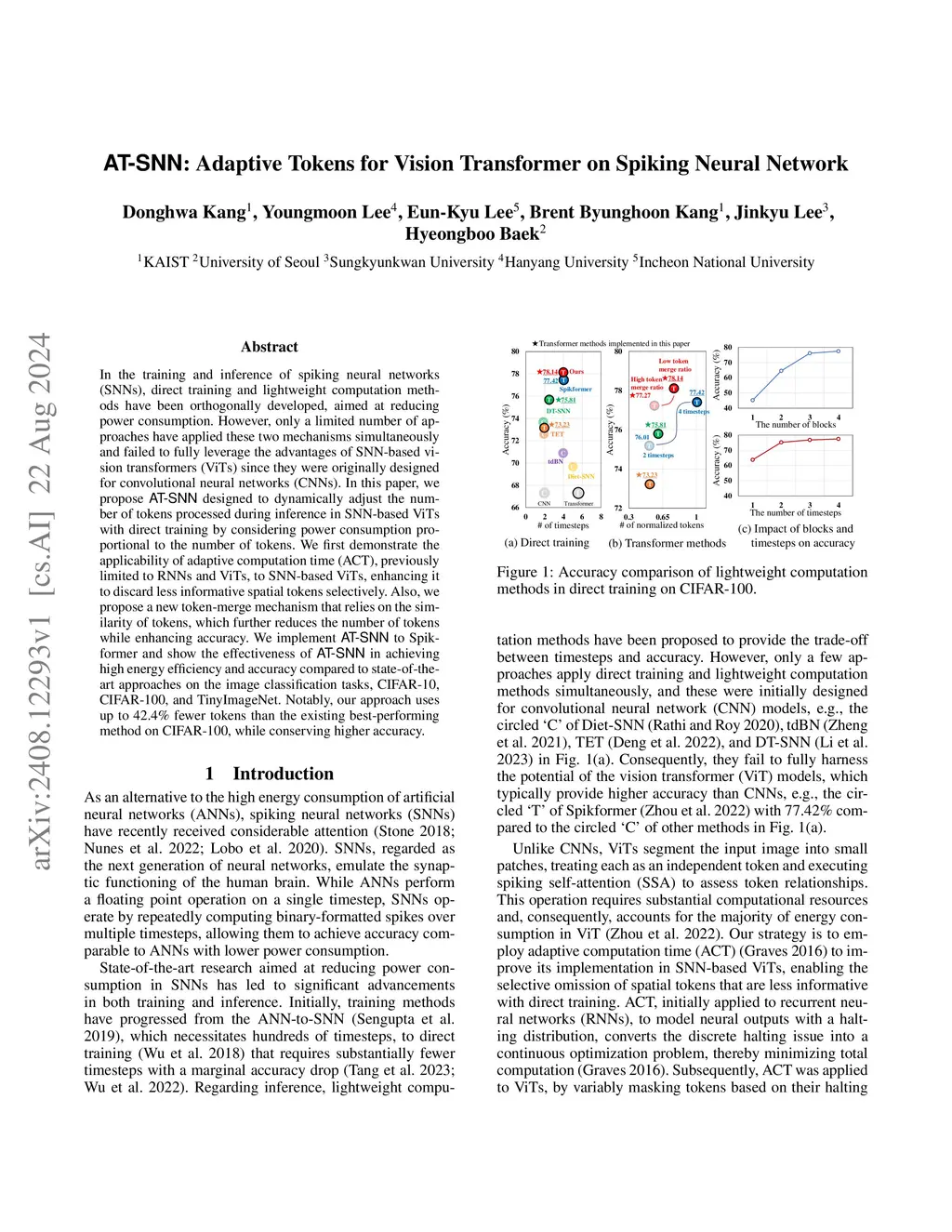 In the training and inference of spiking neural networks (SNNs), direct training and lightweight computation methods have been orthogonally developed, aimed at reducing power consumption. However, only a limited number of approaches have applied these two mechanisms simultaneously and failed to fully leverage the advantages of SNN-based vision transformers (ViTs) since they were originally designed for convolutional neural networks (CNNs). In this paper, we propose AT-SNN designed to dynamically adjust the number of tokens processed during inference in SNN-based ViTs with direct training, wherein power consumption is proportional to the number of tokens. We first demonstrate the applicability of adaptive computation time (ACT), previously limited to RNNs and ViTs, to SNN-based ViTs, enhancing it to discard less informative spatial tokens selectively. Also, we propose a new token-merge mechanism that relies on the similarity of tokens, which further reduces the number of tokens while enhancing accuracy. We implement AT-SNN to Spikformer and show the effectiveness of AT-SNN in achieving high energy efficiency and accuracy compared to state-of-the-art approaches on the image classification tasks, CIFAR10, CIFAR-100, and TinyImageNet. For example, our approach uses up to 42.4% fewer tokens than the existing best-performing method on CIFAR-100, while conserving higher accuracy.