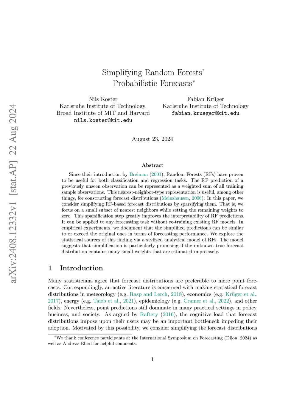 Since their introduction by Breiman, Random Forests (RFs) have proven to be useful for both classification and regression tasks. The RF prediction of a previously unseen observation can be represented as a weighted sum of all training sample observations. This nearest-neighbor-type representation is useful, among other things, for constructing forecast distributions (Meinshausen, 2006). In this paper, we consider simplifying RF-based forecast distributions by sparsifying them. That is, we focus on a small subset of nearest neighbors while setting the remaining weights to zero. This simplification, which we refer to as `Top', greatly improves the interpretability of RF predictions. It can be applied to any forecasting task without re-training existing RF models. In empirical experiments, we document that the simplified predictions can be similar to or exceed the original ones in terms of forecasting performance. We explore the statistical sources of this finding via a stylized analytical model of RFs. The model suggests that simplification is particularly promising if the unknown true forecast distribution contains many small weights that are estimated imprecisely.