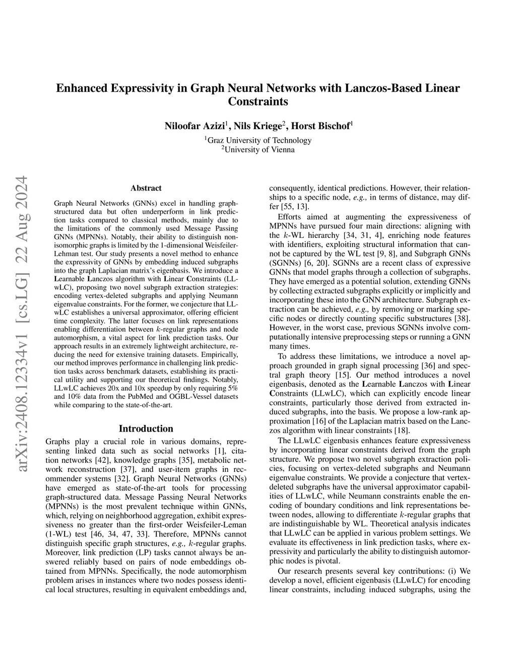 Graph Neural Networks (GNNs) excel in handling graph-structured data but often underperform in link prediction tasks compared to classical methods, mainly due to the limitations of the commonly used message-passing principle. Notably, their ability to distinguish non-isomorphic graphs is limited by the 1-dimensional Weisfeiler-Lehman test. Our study presents a novel method to enhance the expressivity of GNNs by embedding induced subgraphs into the graph Laplacian matrix's eigenbasis. We introduce a Learnable Lanczos algorithm with Linear Constraints (LLwLC), proposing two novel subgraph extraction strategies: encoding vertex-deleted subgraphs and applying Neumann eigenvalue constraints. For the former, we demonstrate the ability to distinguish graphs that are indistinguishable by 2-WL, while maintaining efficient time complexity. The latter focuses on link representations enabling differentiation between -regular graphs and node automorphism, a vital aspect for link prediction tasks. Our approach results in an extremely lightweight architecture, reducing the need for extensive training datasets. Empirically, our method improves performance in challenging link prediction tasks across benchmark datasets, establishing its practical utility and supporting our theoretical findings. Notably, LLwLC achieves 20x and 10x speedup by only requiring 5% and 10% data from the PubMed and OGBL-Vessel datasets while comparing to the state-of-the-art.