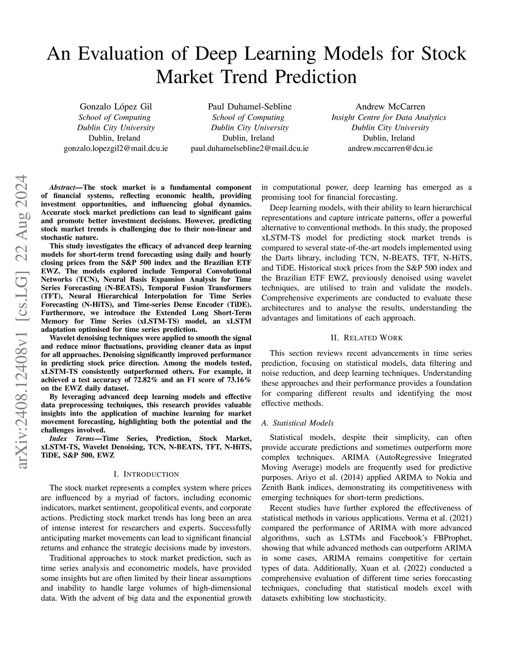 The stock market is a fundamental component of financial systems, reflecting economic health, providing investment opportunities, and influencing global dynamics. Accurate stock market predictions can lead to significant gains and promote better investment decisions. However, predicting stock market trends is challenging due to their non-linear and stochastic nature. This study investigates the efficacy of advanced deep learning models for short-term trend forecasting using daily and hourly closing prices from the S&P 500 index and the Brazilian ETF EWZ. The models explored include Temporal Convolutional Networks (TCN), Neural Basis Expansion Analysis for Time Series Forecasting (N-BEATS), Temporal Fusion Transformers (TFT), Neural Hierarchical Interpolation for Time Series Forecasting (N-HiTS), and Time-series Dense Encoder (TiDE). Furthermore, we introduce the Extended Long Short-Term Memory for Time Series (xLSTM-TS) model, an xLSTM adaptation optimised for time series prediction. Wavelet denoising techniques were applied to smooth the signal and reduce minor fluctuations, providing cleaner data as input for all approaches. Denoising significantly improved performance in predicting stock price direction. Among the models tested, xLSTM-TS consistently outperformed others. For example, it achieved a test accuracy of 72.82% and an F1 score of 73.16% on the EWZ daily dataset. By leveraging advanced deep learning models and effective data preprocessing techniques, this research provides valuable insights into the application of machine learning for market movement forecasting, highlighting both the potential and the challenges involved.