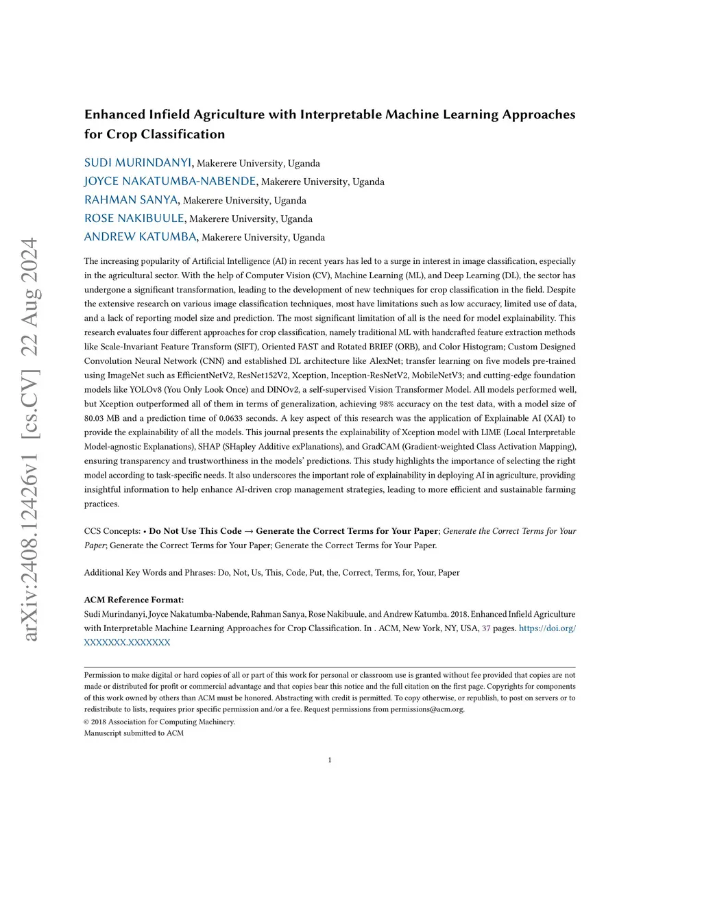 The increasing popularity of Artificial Intelligence in recent years has led to a surge in interest in image classification, especially in the agricultural sector. With the help of Computer Vision, Machine Learning, and Deep Learning, the sector has undergone a significant transformation, leading to the development of new techniques for crop classification in the field. Despite the extensive research on various image classification techniques, most have limitations such as low accuracy, limited use of data, and a lack of reporting model size and prediction. The most significant limitation of all is the need for model explainability. This research evaluates four different approaches for crop classification, namely traditional ML with handcrafted feature extraction methods like SIFT, ORB, and Color Histogram; Custom Designed CNN and established DL architecture like AlexNet; transfer learning on five models pre-trained using ImageNet such as EfficientNetV2, ResNet152V2, Xception, Inception-ResNetV2, MobileNetV3; and cutting-edge foundation models like YOLOv8 and DINOv2, a self-supervised Vision Transformer Model. All models performed well, but Xception outperformed all of them in terms of generalization, achieving 98% accuracy on the test data, with a model size of 80.03 MB and a prediction time of 0.0633 seconds. A key aspect of this research was the application of Explainable AI to provide the explainability of all the models. This journal presents the explainability of Xception model with LIME, SHAP, and GradCAM, ensuring transparency and trustworthiness in the models' predictions. This study highlights the importance of selecting the right model according to task-specific needs. It also underscores the important role of explainability in deploying AI in agriculture, providing insightful information to help enhance AI-driven crop management strategies.