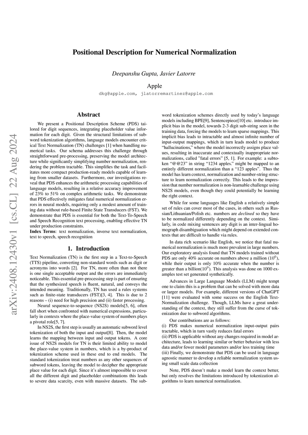 We present a Positional Description Scheme (PDS) tailored for digit sequences, integrating placeholder value information for each digit. Given the structural limitations of subword tokenization algorithms, language models encounter critical Text Normalization (TN) challenges when handling numerical tasks. Our schema addresses this challenge through straightforward pre-processing, preserving the model architecture while significantly simplifying number normalization, rendering the problem tractable. This simplifies the task and facilitates more compact production-ready models capable of learning from smaller datasets. Furthermore, our investigations reveal that PDS enhances the arithmetic processing capabilities of language models, resulting in a relative accuracy improvement of 23% to 51% on complex arithmetic tasks. We demonstrate that PDS effectively mitigates fatal numerical normalization errors in neural models, requiring only a modest amount of training data without rule-based Finite State Transducers (FST). We demonstrate that PDS is essential for both the Text-To-Speech and Speech Recognition text processing, enabling effective TN under production constraints.