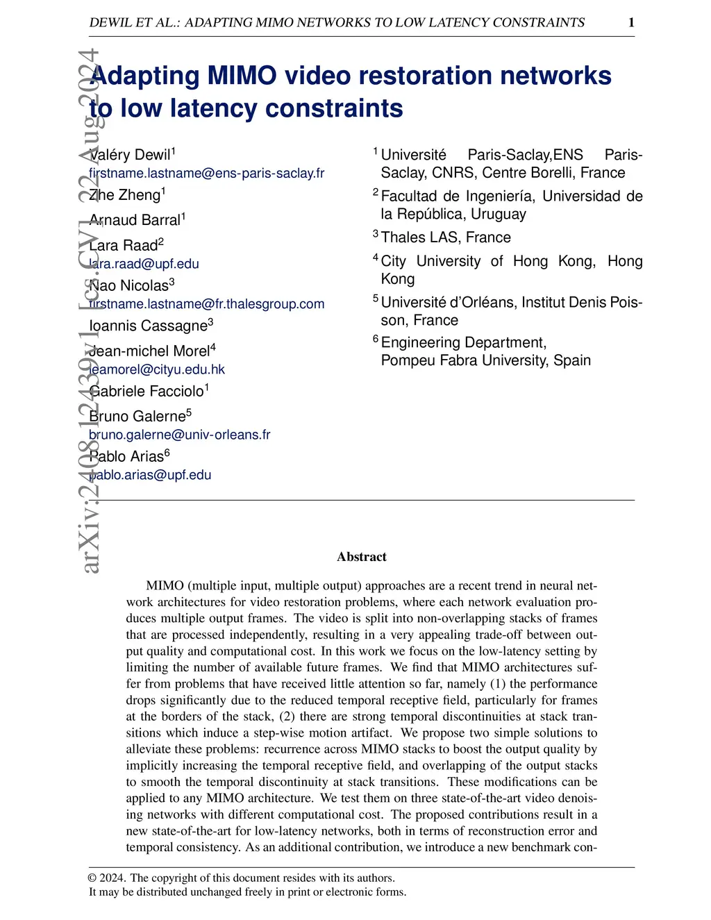 Adapting MIMO video restoration networks to low latency constraints