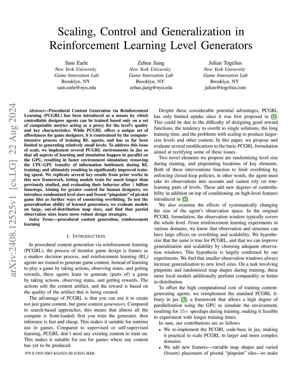 Procedural Content Generation via Reinforcement Learning (PCGRL) has been introduced as a means by which controllable designer agents can be trained based only on a set of computable metrics acting as a proxy for the level's quality and key characteristics. While PCGRL offers a unique set of affordances for game designers, it is constrained by the compute-intensive process of training RL agents, and has so far been limited to generating relatively small levels. To address this issue of scale, we implement several PCGRL environments in Jax so that all aspects of learning and simulation happen in parallel on the GPU, resulting in faster environment simulation; removing the CPU-GPU transfer of information bottleneck during RL training; and ultimately resulting in significantly improved training speed. We replicate several key results from prior works in this new framework, letting models train for much longer than previously studied, and evaluating their behavior after 1 billion timesteps. Aiming for greater control for human designers, we introduce randomized level sizes and frozen "pinpoints" of pivotal game tiles as further ways of countering overfitting. To test the generalization ability of learned generators, we evaluate models on large, out-of-distribution map sizes, and find that partial observation sizes learn more robust design strategies.