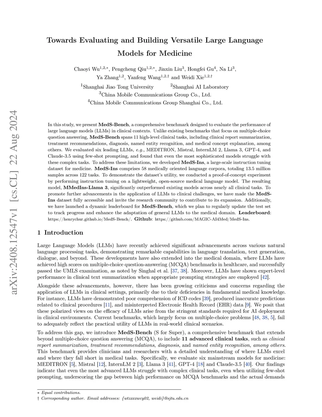 In this study, we present MedS-Bench, a comprehensive benchmark designed to evaluate the performance of large language models (LLMs) in clinical contexts. Unlike existing benchmarks that focus on multiple-choice question answering, MedS-Bench spans 11 high-level clinical tasks, including clinical report summarization, treatment recommendations, diagnosis, named entity recognition, and medical concept explanation, among others. We evaluated six leading LLMs, e.g., MEDITRON, Mistral, InternLM 2, Llama 3, GPT-4, and Claude-3.5 using few-shot prompting, and found that even the most sophisticated models struggle with these complex tasks. To address these limitations, we developed MedS-Ins, a large-scale instruction tuning dataset for medicine. MedS-Ins comprises 58 medically oriented language corpora, totaling 13.5 million samples across 122 tasks. To demonstrate the dataset's utility, we conducted a proof-of-concept experiment by performing instruction tuning on a lightweight, open-source medical language model. The resulting model, MMedIns-Llama 3, significantly outperformed existing models across nearly all clinical tasks. To promote further advancements in the application of LLMs to clinical challenges, we have made the MedS-Ins dataset fully accessible and invite the research community to contribute to its expansion.Additionally, we have launched a dynamic leaderboard for MedS-Bench, which we plan to regularly update the test set to track progress and enhance the adaptation of general LLMs to the medical domain. Leaderboard: https://henrychur.github.io/MedS-Bench/. Github: https://github.com/MAGIC-AI4Med/MedS-Ins.