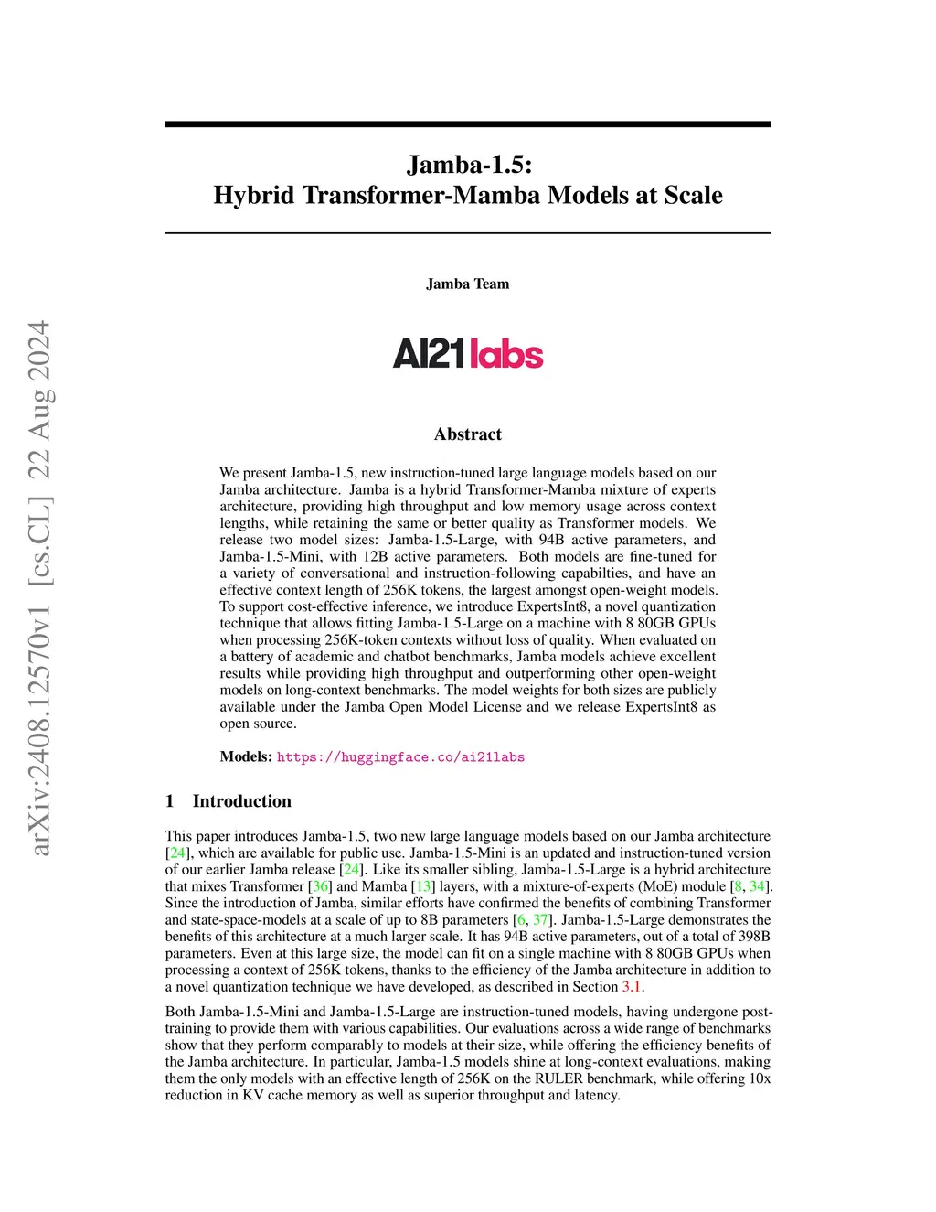 We present Jamba-1.5, new instruction-tuned large language models based on our Jamba architecture. Jamba is a hybrid Transformer-Mamba mixture of experts architecture, providing high throughput and low memory usage across context lengths, while retaining the same or better quality as Transformer models. We release two model sizes: Jamba-1.5-Large, with 94B active parameters, and Jamba-1.5-Mini, with 12B active parameters. Both models are fine-tuned for a variety of conversational and instruction-following capabilties, and have an effective context length of 256K tokens, the largest amongst open-weight models. To support cost-effective inference, we introduce ExpertsInt8, a novel quantization technique that allows fitting Jamba-1.5-Large on a machine with 8 80GB GPUs when processing 256K-token contexts without loss of quality. When evaluated on a battery of academic and chatbot benchmarks, Jamba-1.5 models achieve excellent results while providing high throughput and outperforming other open-weight models on long-context benchmarks. The model weights for both sizes are publicly available under the Jamba Open Model License and we release ExpertsInt8 as open source.