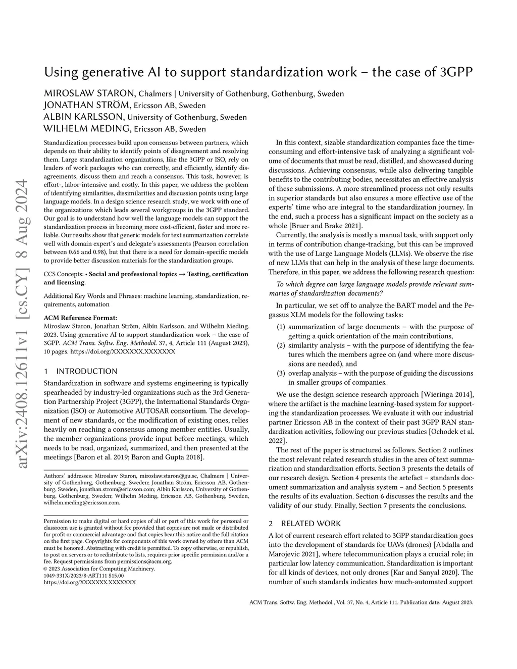 Standardization processes build upon consensus between partners, which depends on their ability to identify points of disagreement and resolving them. Large standardization organizations, like the 3GPP or ISO, rely on leaders of work packages who can correctly, and efficiently, identify disagreements, discuss them and reach a consensus. This task, however, is effort-, labor-intensive and costly. In this paper, we address the problem of identifying similarities, dissimilarities and discussion points using large language models. In a design science research study, we work with one of the organizations which leads several workgroups in the 3GPP standard. Our goal is to understand how well the language models can support the standardization process in becoming more cost-efficient, faster and more reliable. Our results show that generic models for text summarization correlate well with domain expert's and delegate's assessments (Pearson correlation between 0.66 and 0.98), but that there is a need for domain-specific models to provide better discussion materials for the standardization groups.