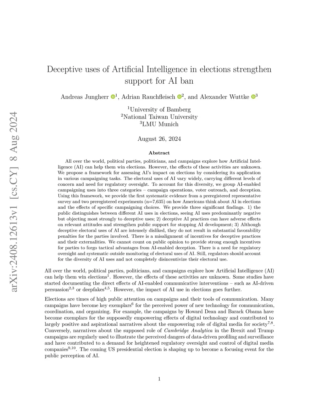 As political parties around the world experiment with Artificial Intelligence (AI) in election campaigns, concerns about deception and manipulation are rising. This article examines how the public reacts to different uses of AI in elections and the potential consequences for party evaluations and regulatory preferences. Across three preregistered studies with over 7,600 American respondents, we identify three categories of AI use -- campaign operations, voter outreach, and deception. While people generally dislike AI in campaigns, they are especially critical of deceptive uses, which they perceive as norm violations. However, parties engaging in AI-enabled deception face no significant drop in favorability, neither with supporters nor opponents. Instead, deceptive AI use increases public support for stricter AI regulation, including calls for an outright ban on AI development. These findings reveal a misalignment between public disapproval of deceptive AI and the political incentives of parties, underscoring the need for targeted regulatory oversight. Rather than banning AI in elections altogether, regulation should distinguish between harmful and beneficial applications to avoid stifling democratic innovation.