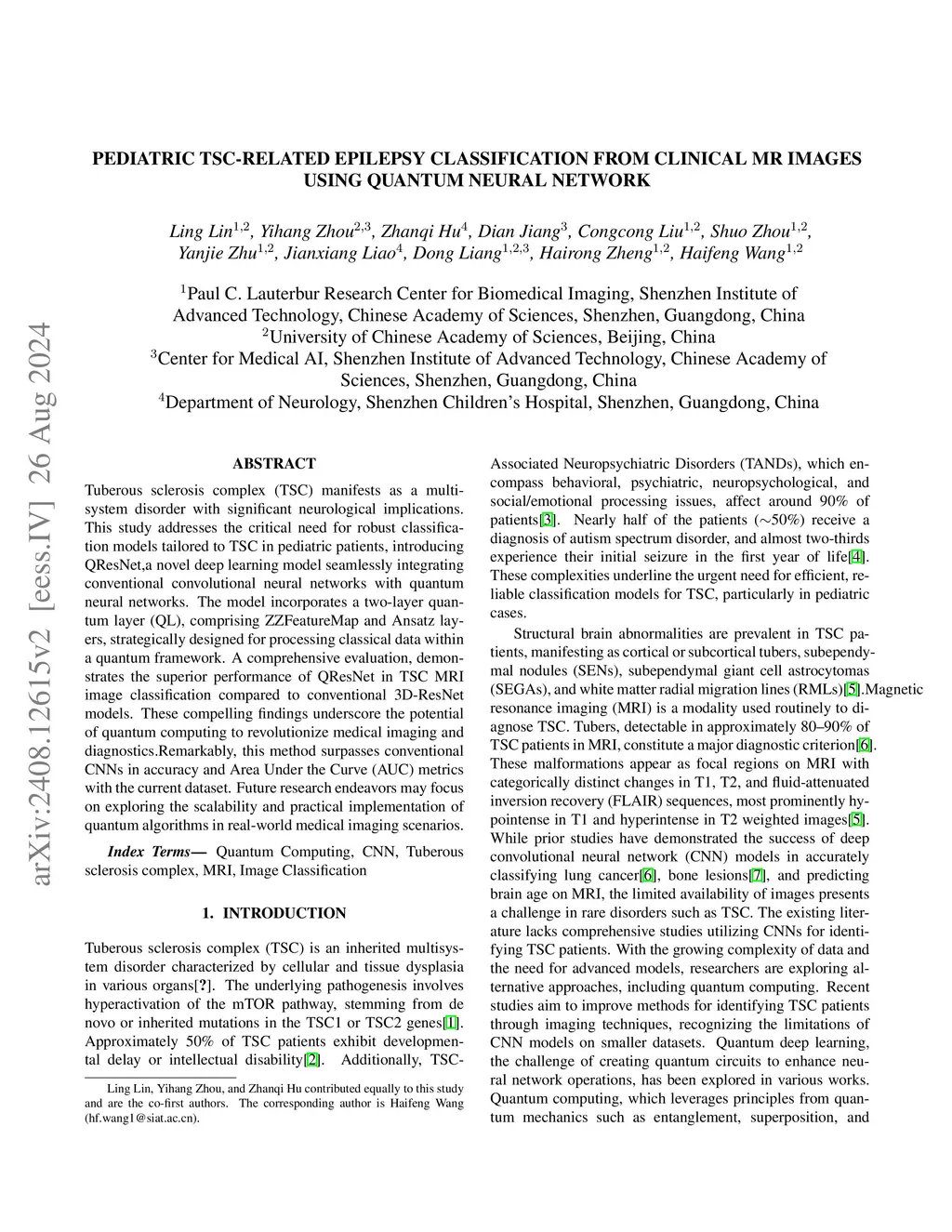 Tuberous sclerosis complex (TSC) manifests as a multisystem disorder with significant neurological implications. This study addresses the critical need for robust classification models tailored to TSC in pediatric patients, introducing QResNet,a novel deep learning model seamlessly integrating conventional convolutional neural networks with quantum neural networks. The model incorporates a two-layer quantum layer (QL), comprising ZZFeatureMap and Ansatz layers, strategically designed for processing classical data within a quantum framework. A comprehensive evaluation, demonstrates the superior performance of QResNet in TSC MRI image classification compared to conventional 3D-ResNet models. These compelling findings underscore the potential of quantum computing to revolutionize medical imaging and diagnostics.Remarkably, this method surpasses conventional CNNs in accuracy and Area Under the Curve (AUC) metrics with the current dataset. Future research endeavors may focus on exploring the scalability and practical implementation of quantum algorithms in real-world medical imaging scenarios.