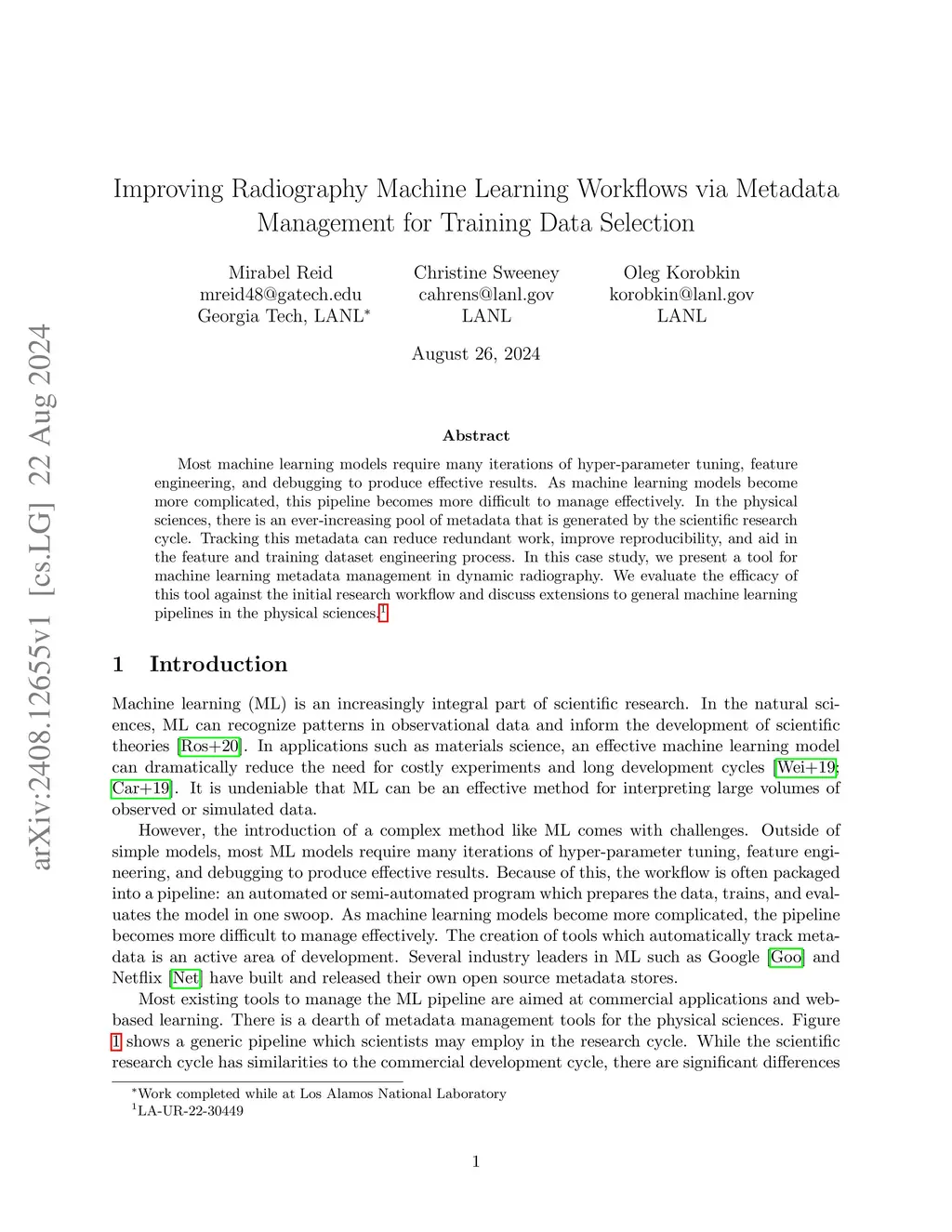 Most machine learning models require many iterations of hyper-parameter tuning, feature engineering, and debugging to produce effective results. As machine learning models become more complicated, this pipeline becomes more difficult to manage effectively. In the physical sciences, there is an ever-increasing pool of metadata that is generated by the scientific research cycle. Tracking this metadata can reduce redundant work, improve reproducibility, and aid in the feature and training dataset engineering process. In this case study, we present a tool for machine learning metadata management in dynamic radiography. We evaluate the efficacy of this tool against the initial research workflow and discuss extensions to general machine learning pipelines in the physical sciences.