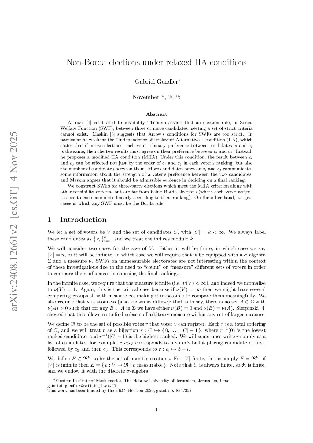 Arrow's celebrated Impossibility Theorem asserts that an election rule, or Social Welfare Function (SWF), between three or more candidates meeting a set of strict criteria cannot exist. Maskin suggests that Arrow's conditions for SWFs are too strict. In particular he weakens the "Independence of Irrelevant Alternatives" condition (IIA), which states that if in two elections, each voter's binary preference between candidates and is the same, then the two results must agree on their preference between and . Instead, he proposes a modified IIA condition (MIIA). Under this condition, the result between and can be affected not just by the order of and in each voter's ranking, but also the number of candidates between them. More candidates between and communicates some information about the strength of a voter's preference between the two candidates, and Maskin argues that it should be admissible evidence in deciding on a final ranking.We construct SWFs for three-party elections which meet the MIIA criterion along with other sensibility criteria, but are far from being Borda elections (where each voter assigns a score to each candidate linearly according to their ranking). On the other hand, we give cases in which any SWF must be the Borda rule.