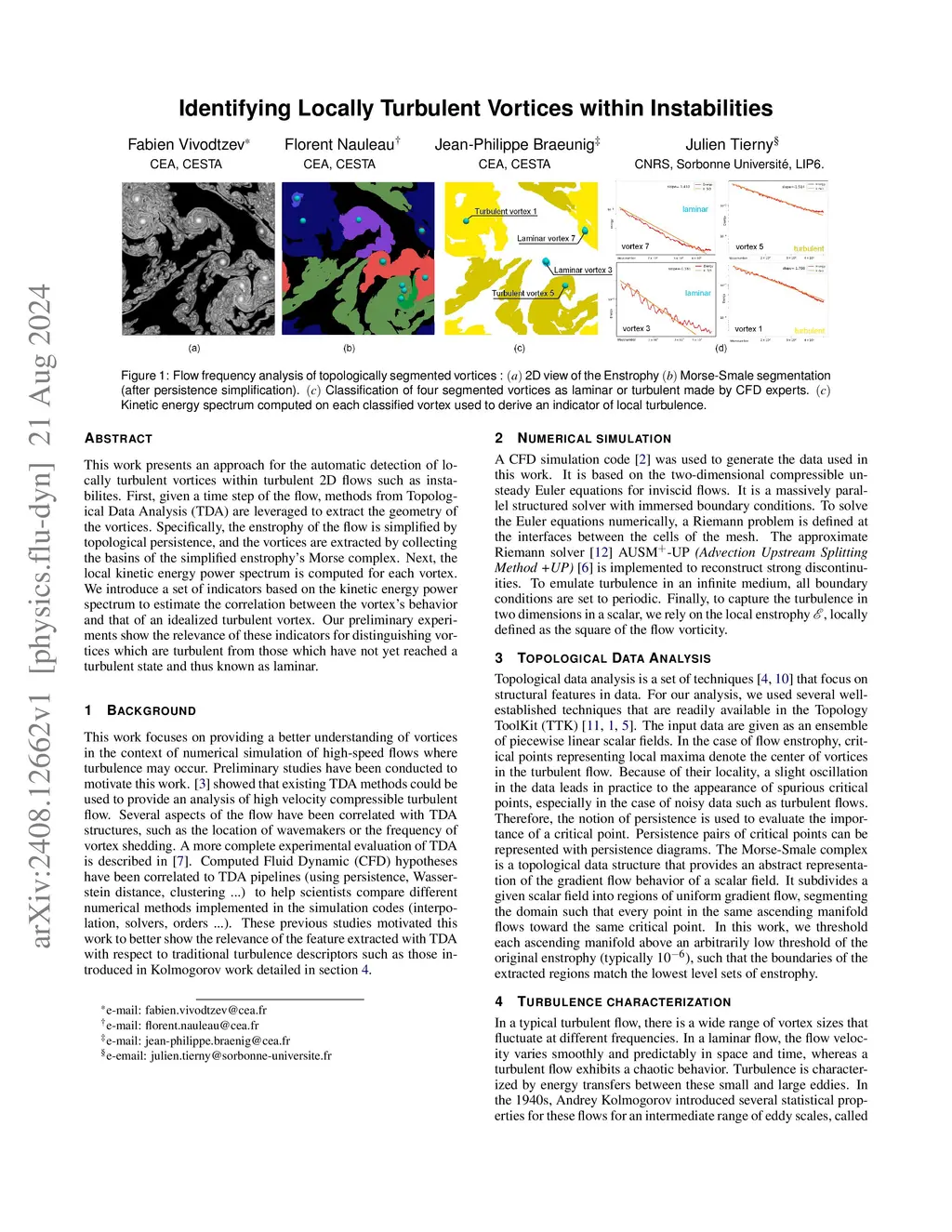 This work presents an approach for the automatic detection of locally turbulent vortices within turbulent 2D flows such as instabilites. First, given a time step of the flow, methods from Topological Data Analysis (TDA) are leveraged to extract the geometry of the vortices. Specifically, the enstrophy of the flow is simplified by topological persistence, and the vortices are extracted by collecting the basins of the simplified enstrophy's Morse complex. Next, the local kinetic energy power spectrum is computed for each vortex. We introduce a set of indicators based on the kinetic energy power spectrum to estimate the correlation between the vortex's behavior and that of an idealized turbulent vortex. Our preliminary experiments show the relevance of these indicators for distinguishing vortices which are turbulent from those which have not yet reached a turbulent state and thus known as laminar.