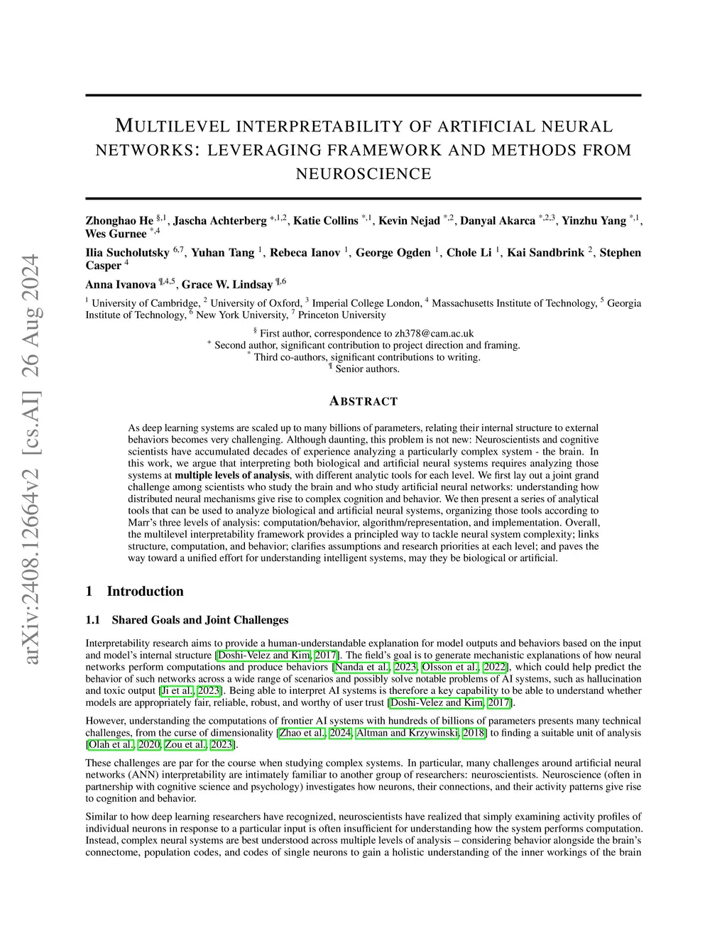 As deep learning systems are scaled up to many billions of parameters, relating their internal structure to external behaviors becomes very challenging. Although daunting, this problem is not new: Neuroscientists and cognitive scientists have accumulated decades of experience analyzing a particularly complex system - the brain. In this work, we argue that interpreting both biological and artificial neural systems requires analyzing those systems at multiple levels of analysis, with different analytic tools for each level. We first lay out a joint grand challenge among scientists who study the brain and who study artificial neural networks: understanding how distributed neural mechanisms give rise to complex cognition and behavior. We then present a series of analytical tools that can be used to analyze biological and artificial neural systems, organizing those tools according to Marr's three levels of analysis: computation/behavior, algorithm/representation, and implementation. Overall, the multilevel interpretability framework provides a principled way to tackle neural system complexity; links structure, computation, and behavior; clarifies assumptions and research priorities at each level; and paves the way toward a unified effort for understanding intelligent systems, may they be biological or artificial.
