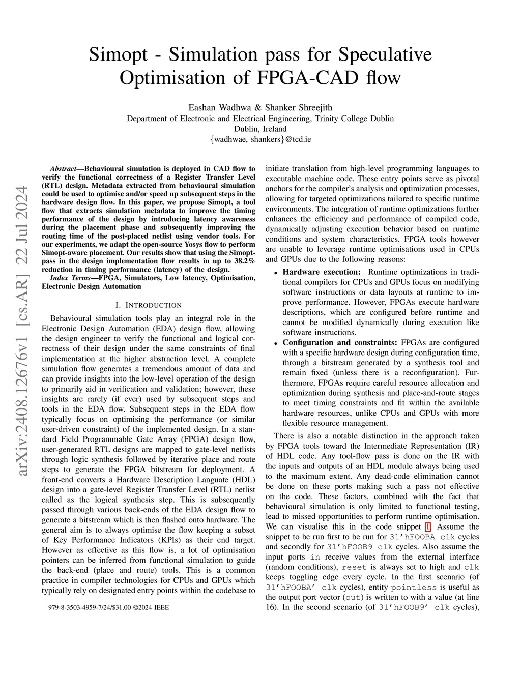 Simopt -- Simulation pass for Speculative Optimisation of FPGA-CAD flow