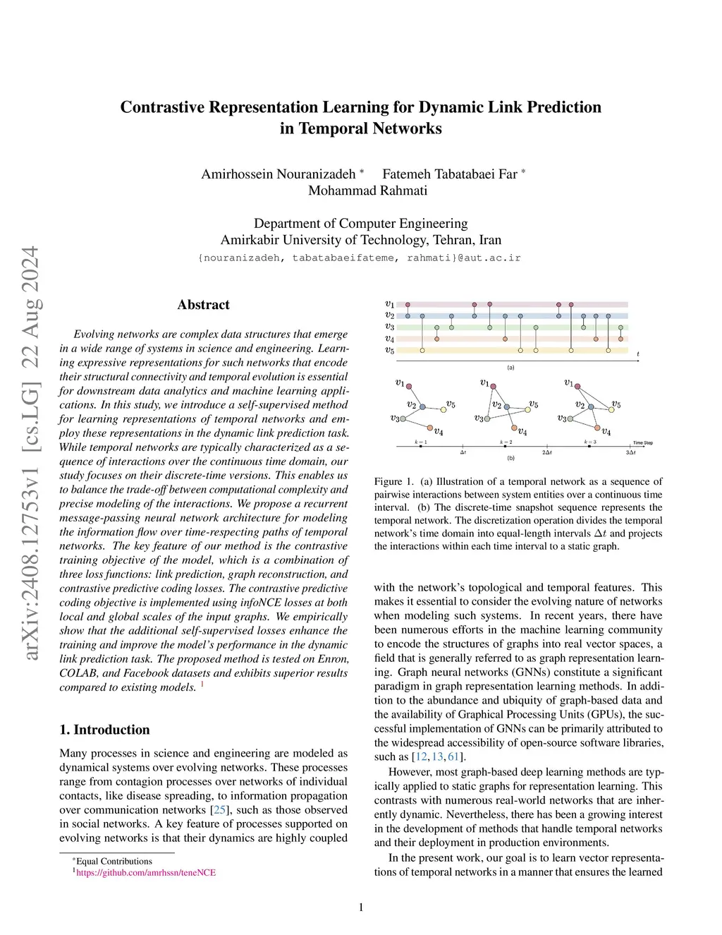 Evolving networks are complex data structures that emerge in a wide range of systems in science and engineering. Learning expressive representations for such networks that encode their structural connectivity and temporal evolution is essential for downstream data analytics and machine learning applications. In this study, we introduce a self-supervised method for learning representations of temporal networks and employ these representations in the dynamic link prediction task. While temporal networks are typically characterized as a sequence of interactions over the continuous time domain, our study focuses on their discrete-time versions. This enables us to balance the trade-off between computational complexity and precise modeling of the interactions. We propose a recurrent message-passing neural network architecture for modeling the information flow over time-respecting paths of temporal networks. The key feature of our method is the contrastive training objective of the model, which is a combination of three loss functions: link prediction, graph reconstruction, and contrastive predictive coding losses. The contrastive predictive coding objective is implemented using infoNCE losses at both local and global scales of the input graphs. We empirically show that the additional self-supervised losses enhance the training and improve the model's performance in the dynamic link prediction task. The proposed method is tested on Enron, COLAB, and Facebook datasets and exhibits superior results compared to existing models.