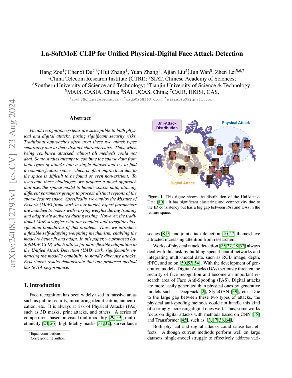 Facial recognition systems are susceptible to both physical and digital attacks, posing significant security risks. Traditional approaches often treat these two attack types separately due to their distinct characteristics. Thus, when being combined attacked, almost all methods could not deal. Some studies attempt to combine the sparse data from both types of attacks into a single dataset and try to find a common feature space, which is often impractical due to the space is difficult to be found or even non-existent. To overcome these challenges, we propose a novel approach that uses the sparse model to handle sparse data, utilizing different parameter groups to process distinct regions of the sparse feature space. Specifically, we employ the Mixture of Experts (MoE) framework in our model, expert parameters are matched to tokens with varying weights during training and adaptively activated during testing. However, the traditional MoE struggles with the complex and irregular classification boundaries of this problem. Thus, we introduce a flexible self-adapting weighting mechanism, enabling the model to better fit and adapt. In this paper, we proposed La-SoftMoE CLIP, which allows for more flexible adaptation to the Unified Attack Detection (UAD) task, significantly enhancing the model's capability to handle diversity attacks. Experiment results demonstrate that our proposed method has SOTA performance.