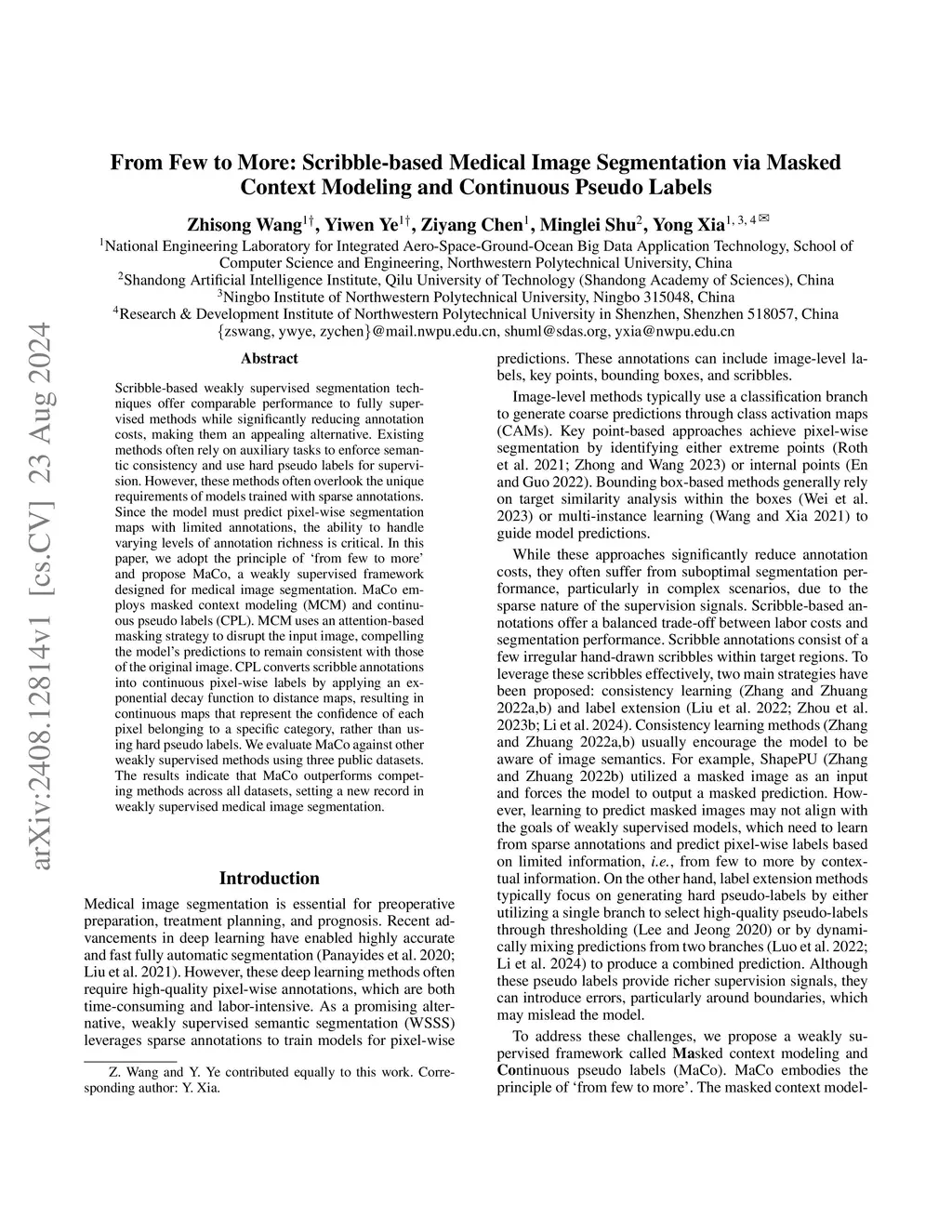 Scribble-based weakly supervised segmentation methods have shown promising results in medical image segmentation, significantly reducing annotation costs. However, existing approaches often rely on auxiliary tasks to enforce semantic consistency and use hard pseudo labels for supervision, overlooking the unique challenges faced by models trained with sparse annotations. These models must predict pixel-wise segmentation maps from limited data, making it crucial to handle varying levels of annotation richness effectively. In this paper, we propose MaCo, a weakly supervised model designed for medical image segmentation, based on the principle of "from few to more." MaCo leverages Masked Context Modeling (MCM) and Continuous Pseudo Labels (CPL). MCM employs an attention-based masking strategy to perturb the input image, ensuring that the model's predictions align with those of the original image. CPL converts scribble annotations into continuous pixel-wise labels by applying an exponential decay function to distance maps, producing confidence maps that represent the likelihood of each pixel belonging to a specific category, rather than relying on hard pseudo labels. We evaluate MaCo on three public datasets, comparing it with other weakly supervised methods. Our results show that MaCo outperforms competing methods across all datasets, establishing a new record in weakly supervised medical image segmentation.