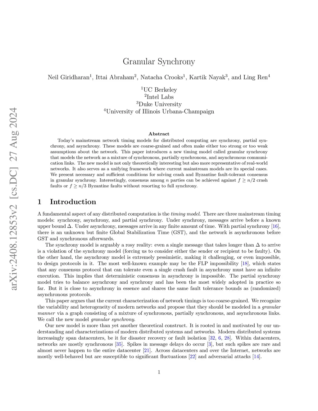 Today's mainstream network timing models for distributed computing are synchrony, partial synchrony, and asynchrony. These models are coarse-grained and often make either too strong or too weak assumptions about the network. This paper introduces a new timing model called granular synchrony that models the network as a mixture of synchronous, partially synchronous, and asynchronous communication links. The new model is not only theoretically interesting but also more representative of real-world networks. It also serves as a unifying framework where current mainstream models are its special cases. We present necessary and sufficient conditions for solving crash and Byzantine fault-tolerant consensus in granular synchrony. Interestingly, consensus among parties can be achieved against crash faults or Byzantine faults without resorting to full synchrony.