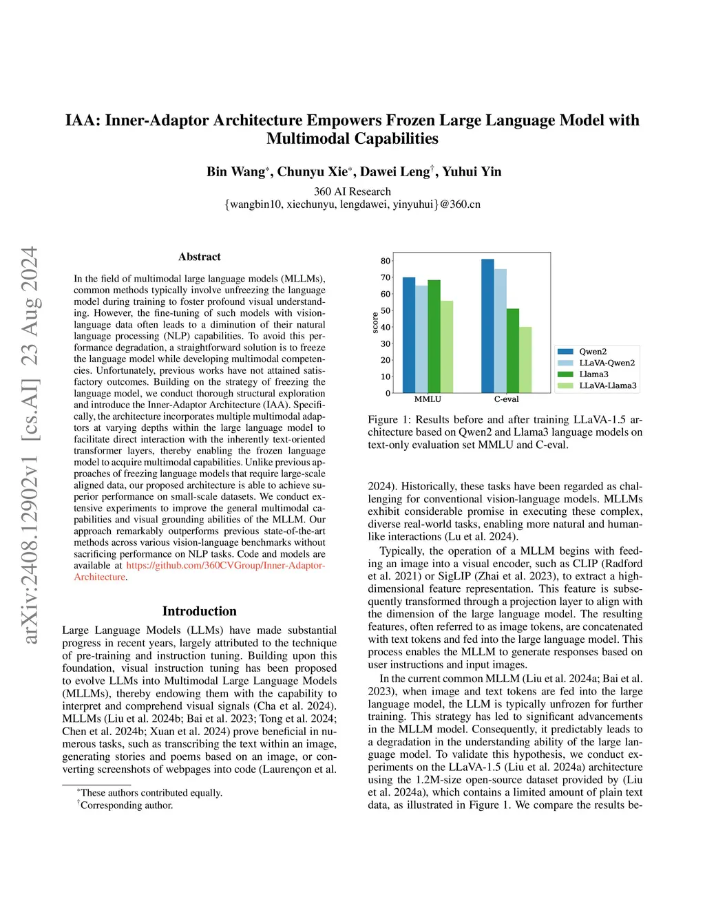 IAA: Inner-Adaptor Architecture Empowers Frozen Large Language Model with Multimodal Capabilities