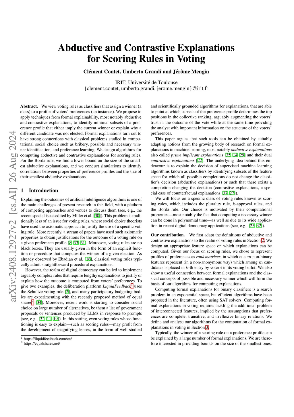 We view voting rules as classifiers that assign a winner (a class) to a profile of voters' preferences (an instance). We propose to apply techniques from formal explainability, most notably abductive and contrastive explanations, to identify minimal subsets of a preference profile that either imply the current winner or explain why a different candidate was not elected. Formal explanations turn out to have strong connections with classical problems studied in computational social choice such as bribery, possible and necessary winner identification, and preference learning. We design algorithms for computing abductive and contrastive explanations for scoring rules. For the Borda rule, we find a lower bound on the size of the smallest abductive explanations, and we conduct simulations to identify correlations between properties of preference profiles and the size of their smallest abductive explanations.