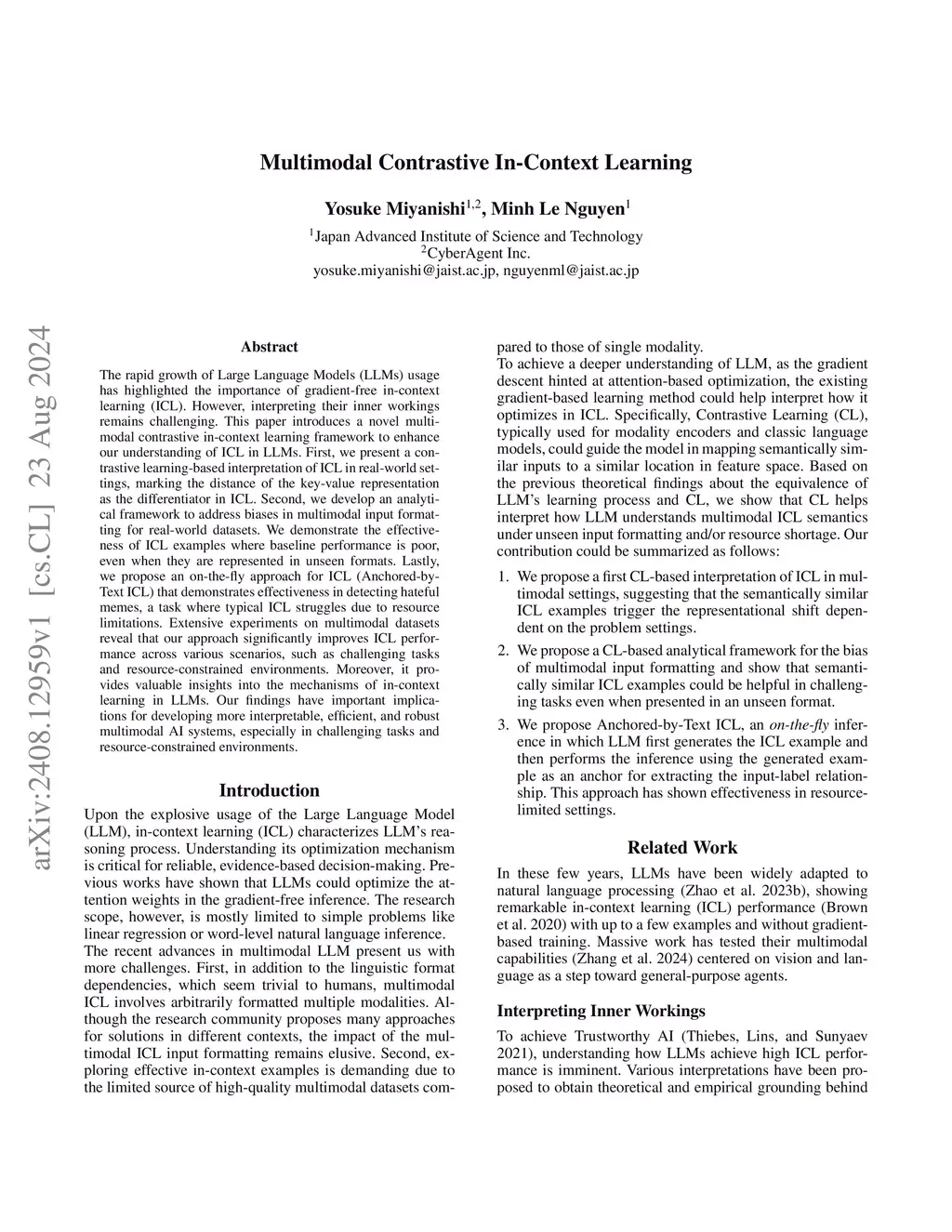 The rapid growth of Large Language Models (LLMs) usage has highlighted the importance of gradient-free in-context learning (ICL). However, interpreting their inner workings remains challenging. This paper introduces a novel multimodal contrastive in-context learning framework to enhance our understanding of ICL in LLMs. First, we present a contrastive learning-based interpretation of ICL in real-world settings, marking the distance of the key-value representation as the differentiator in ICL. Second, we develop an analytical framework to address biases in multimodal input formatting for real-world datasets. We demonstrate the effectiveness of ICL examples where baseline performance is poor, even when they are represented in unseen formats. Lastly, we propose an on-the-fly approach for ICL (Anchored-by-Text ICL) that demonstrates effectiveness in detecting hateful memes, a task where typical ICL struggles due to resource limitations. Extensive experiments on multimodal datasets reveal that our approach significantly improves ICL performance across various scenarios, such as challenging tasks and resource-constrained environments. Moreover, it provides valuable insights into the mechanisms of in-context learning in LLMs. Our findings have important implications for developing more interpretable, efficient, and robust multimodal AI systems, especially in challenging tasks and resource-constrained environments.