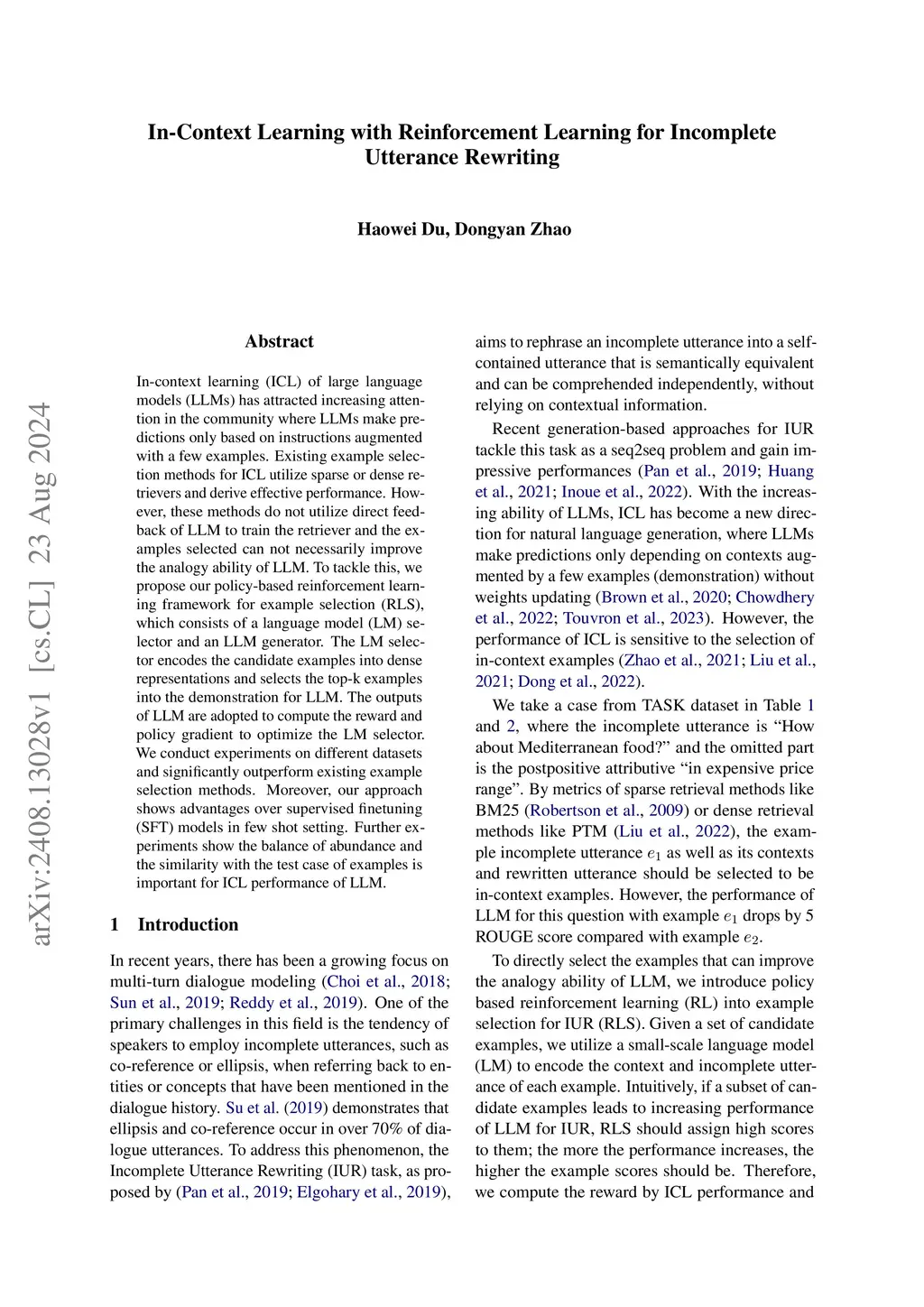 In-Context Learning with Reinforcement Learning for Incomplete Utterance