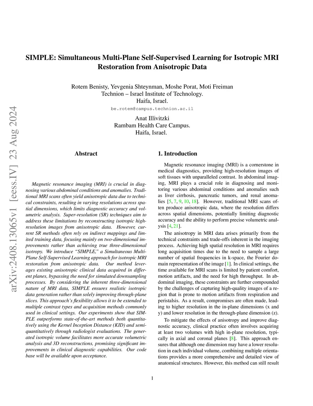 Magnetic resonance imaging (MRI) is crucial in diagnosing various abdominal conditions and anomalies. Traditional MRI scans often yield anisotropic data due to technical constraints, resulting in varying resolutions across spatial dimensions, which limits diagnostic accuracy and volumetric analysis. Super-resolution (SR) techniques aim to address these limitations by reconstructing isotropic high-resolution images from anisotropic data. However, current SR methods often depend on indirect mappings and scarce 3D isotropic data for training, primarily focusing on two-dimensional enhancements rather than achieving genuine three-dimensional isotropy. We introduce ``SIMPLE,'' a Simultaneous Multi-Plane Self-Supervised Learning approach for isotropic MRI restoration from anisotropic data. Our method leverages existing anisotropic clinical data acquired in different planes, bypassing the need for simulated downsampling processes. By considering the inherent three-dimensional nature of MRI data, SIMPLE ensures realistic isotropic data generation rather than solely improving through-plane slices. This approach's flexibility allows it to be extended to multiple contrast types and acquisition methods commonly used in clinical settings. Our experiments on two distinct datasets (brain and abdomen) show that SIMPLE outperforms state-of-the-art methods both quantitatively using the Kernel Inception Distance (KID), semi-quantitatively through radiologist evaluations, and qualitatively through Fourier domain analysis. The generated isotropic volume facilitates more accurate volumetric analysis and 3D reconstructions, promising significant improvements in clinical diagnostic capabilities.