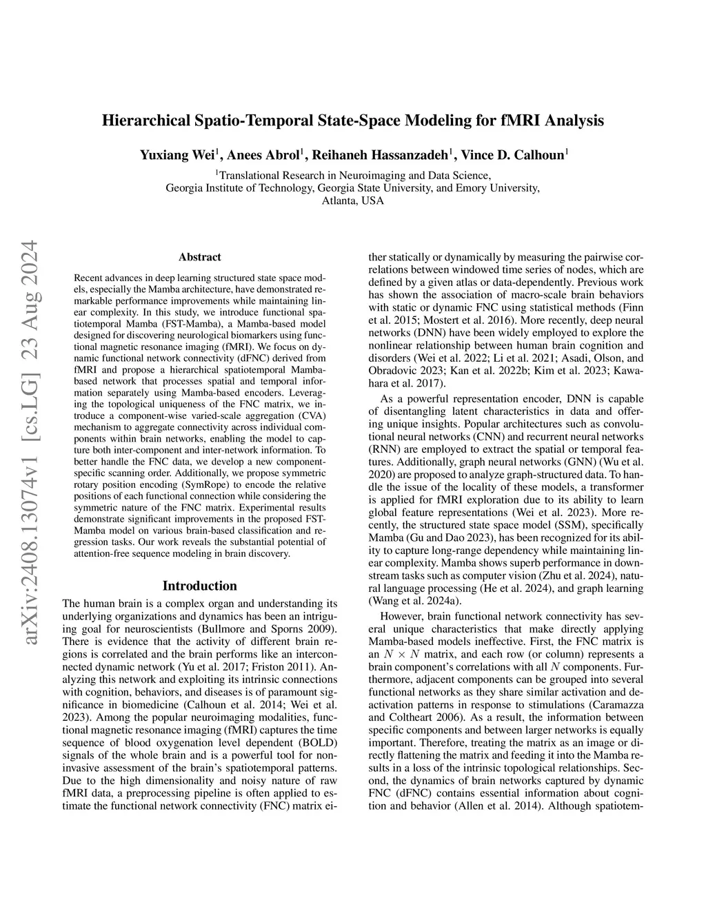 Recent advances in deep learning structured state space models, especially the Mamba architecture, have demonstrated remarkable performance improvements while maintaining linear complexity. In this study, we introduce functional spatiotemporal Mamba (FST-Mamba), a Mamba-based model designed for discovering neurological biomarkers using functional magnetic resonance imaging (fMRI). We focus on dynamic functional network connectivity (dFNC) derived from fMRI and propose a hierarchical spatiotemporal Mamba-based network that processes spatial and temporal information separately using Mamba-based encoders. Leveraging the topological uniqueness of the FNC matrix, we introduce a component-wise varied-scale aggregation (CVA) mechanism to aggregate connectivity across individual components within brain networks, enabling the model to capture component-level and network-level information. Additionally, we propose symmetric rotary position encoding (SymRope) to encode the relative positions of each functional connection while considering the symmetric nature of the FNC matrix. Experimental results demonstrate significant improvements in the proposed FST-Mamba model on various brain-based classification and regression tasks. We further show brain connectivities and dynamics that are crucial for the prediction. Our work reveals the substantial potential of attention-free sequence modeling in brain discovery. The codes are publicly available here:this https URL.