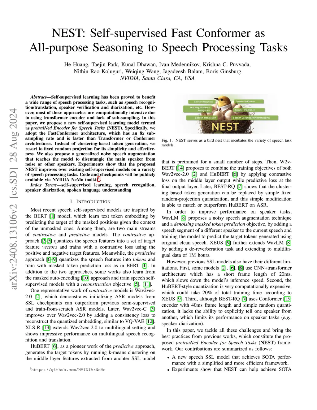 NEST: Self-supervised Fast Conformer as All-purpose Seasoning to Speech